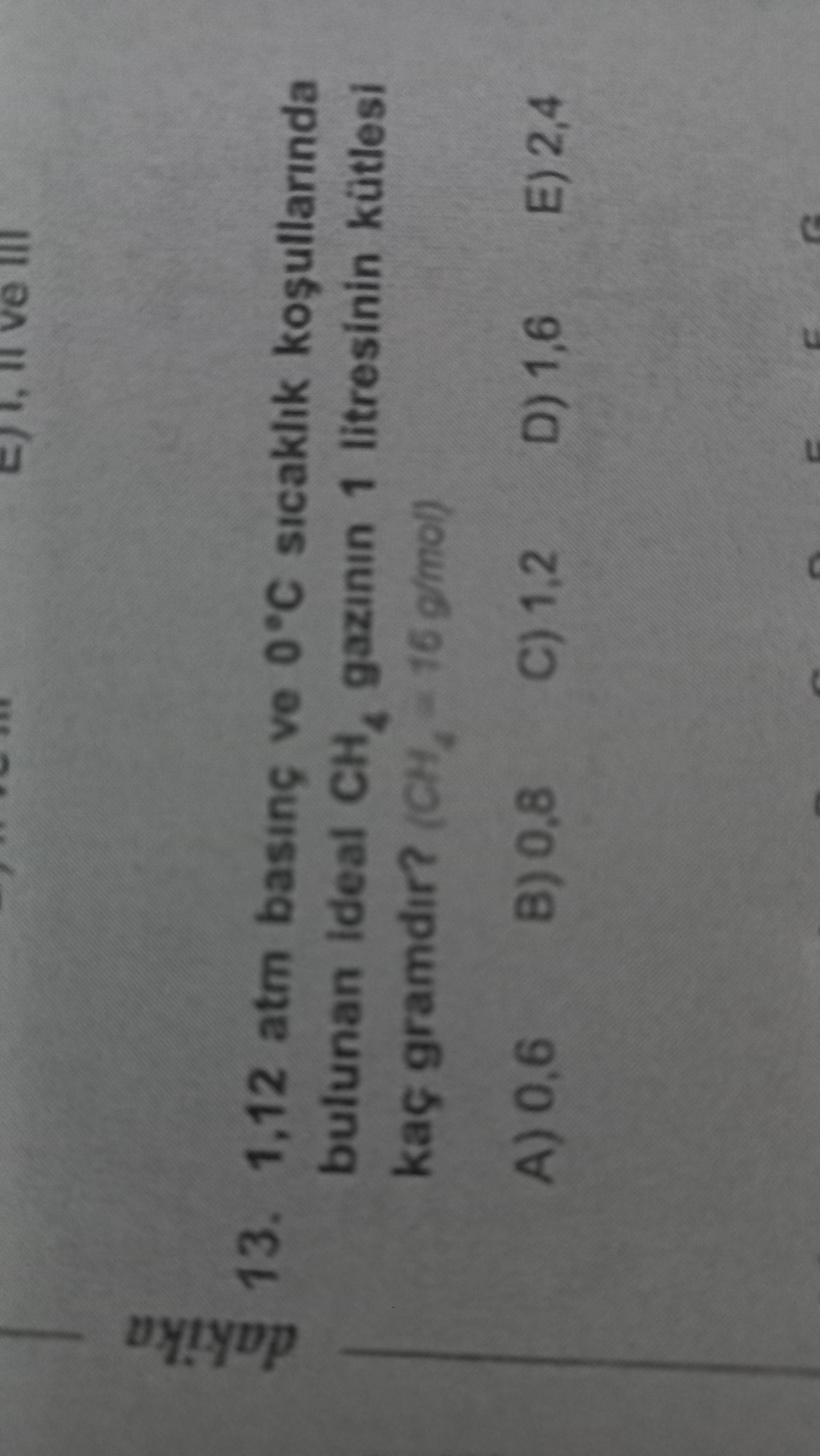 1,12 atm basınç ve 0 °C sıcaklık koşullarında bulunan ideal CH_4 gazının 1 litresinin kütlesi kaç gramdır?