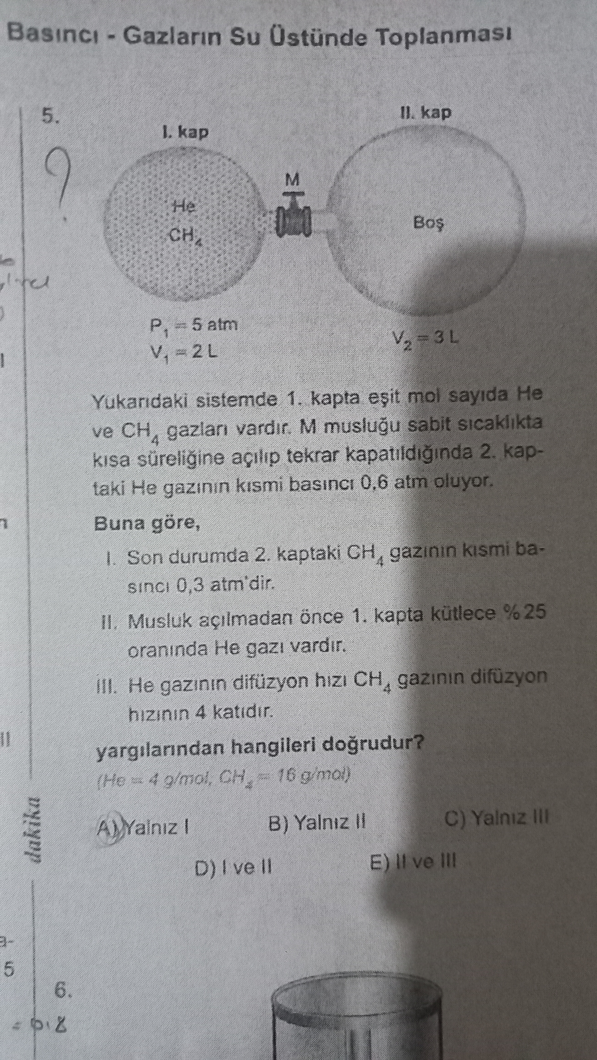 Toplam \text{CH}_4 basıncı yine 1{,}2 \, atm , ama soru kökünde “II. kaptaki CH₄’ün kısmi basıncı 0,6 atm oluyor” dediği için, I. yargıdaki “0,3 atm” yanlış gibi görünüyor; fakat bu testin bilinen çözümünde, difüzyon oranları ve denge koşulu hesaba katıldığında II. kapta $ \text{CH}_4 ’ün kısmi basıncının 0{,}3 , atm $ olacağı kabul edilip I. ifade doğru sayılıyor.