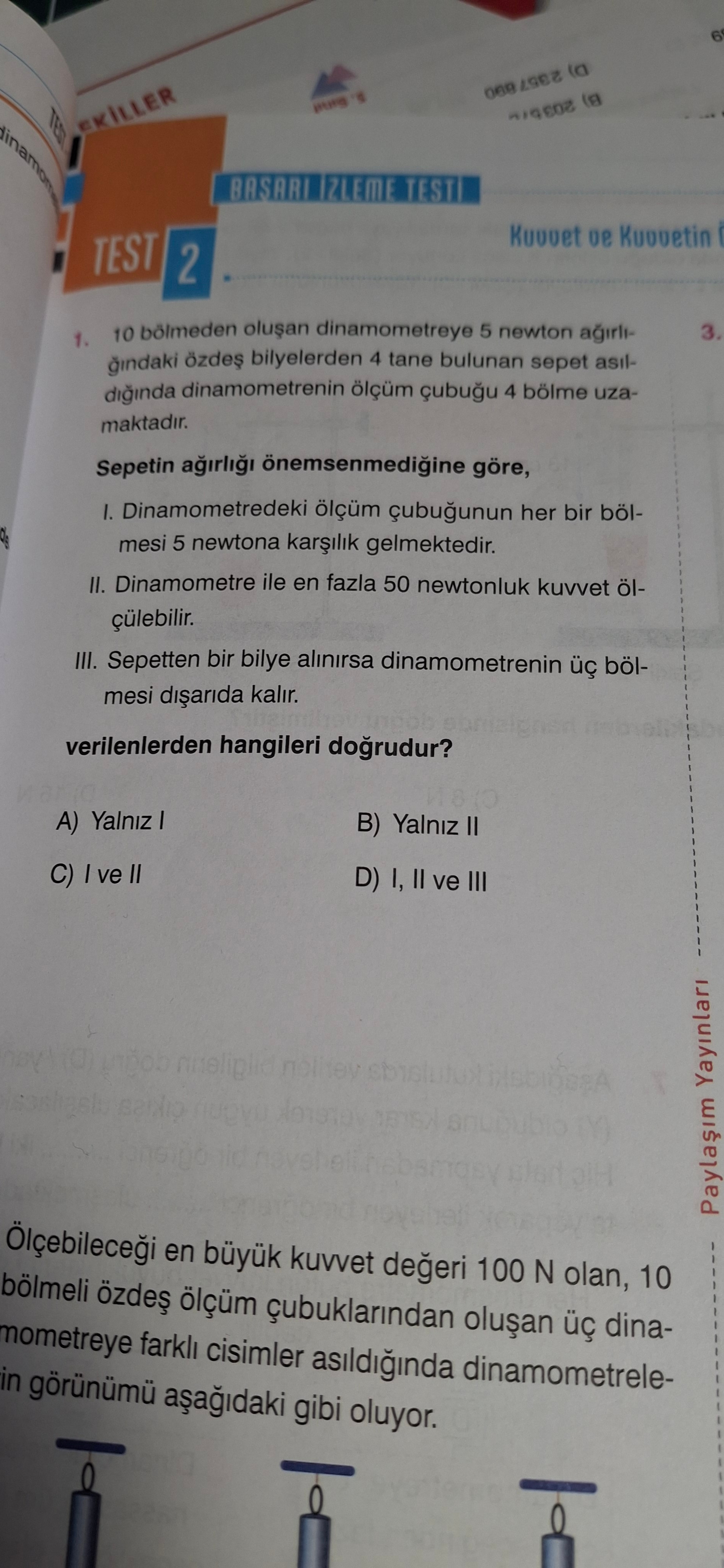 Ölçebileceği en büyük kuvvet değeri 100 N olan, 10 bölmeli özdeş ölçüm çubuklarından oluşan üç dinamometreye farklı cisimler asıldığında dinamometrelerin görünümü aşağıdaki gibi oluyor.