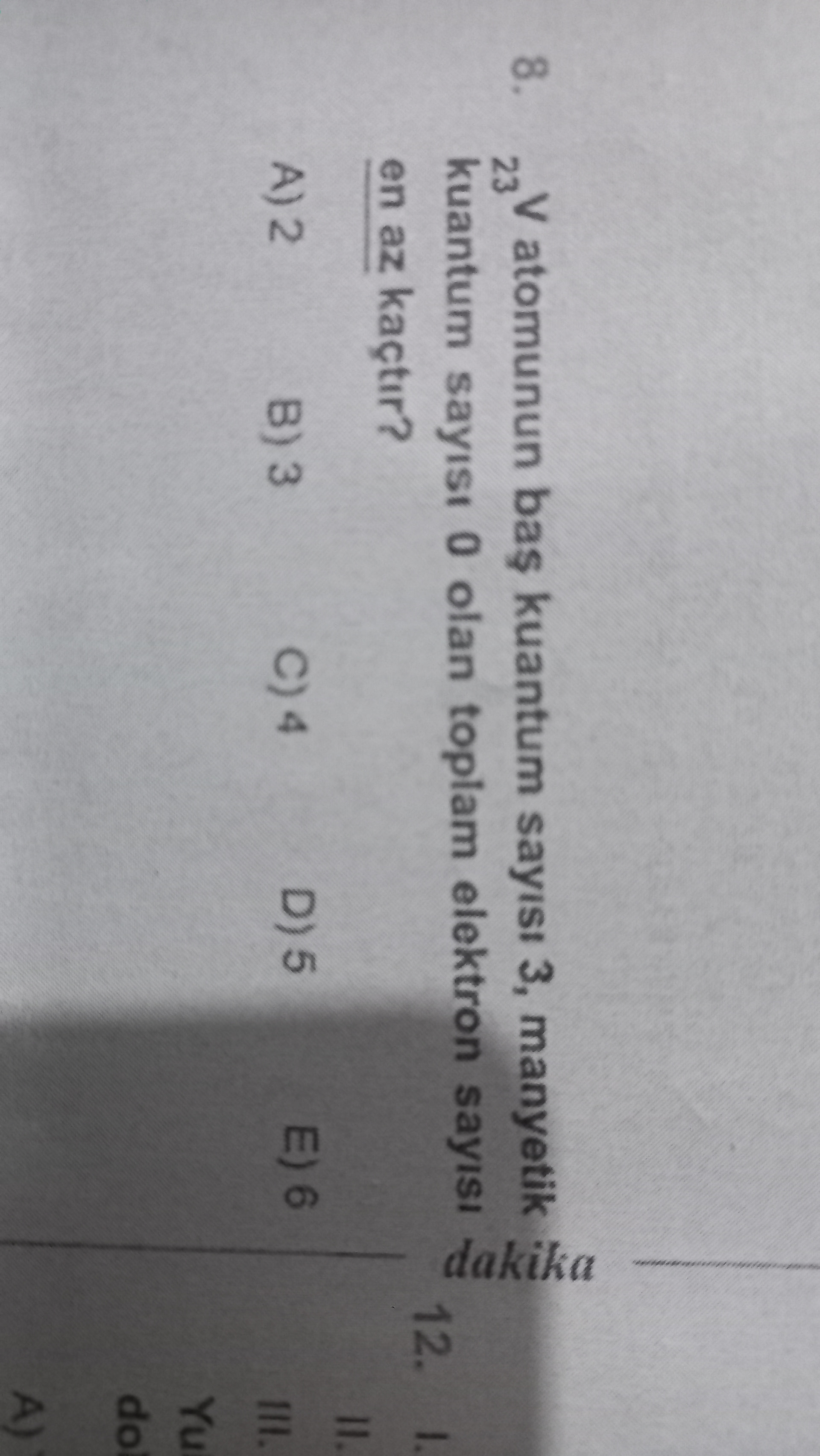 23 V atomunun baş kuantum sayısı 3, manyetik kuantum sayısı 0 olan toplam elektron sayısı en az kaçtır?
