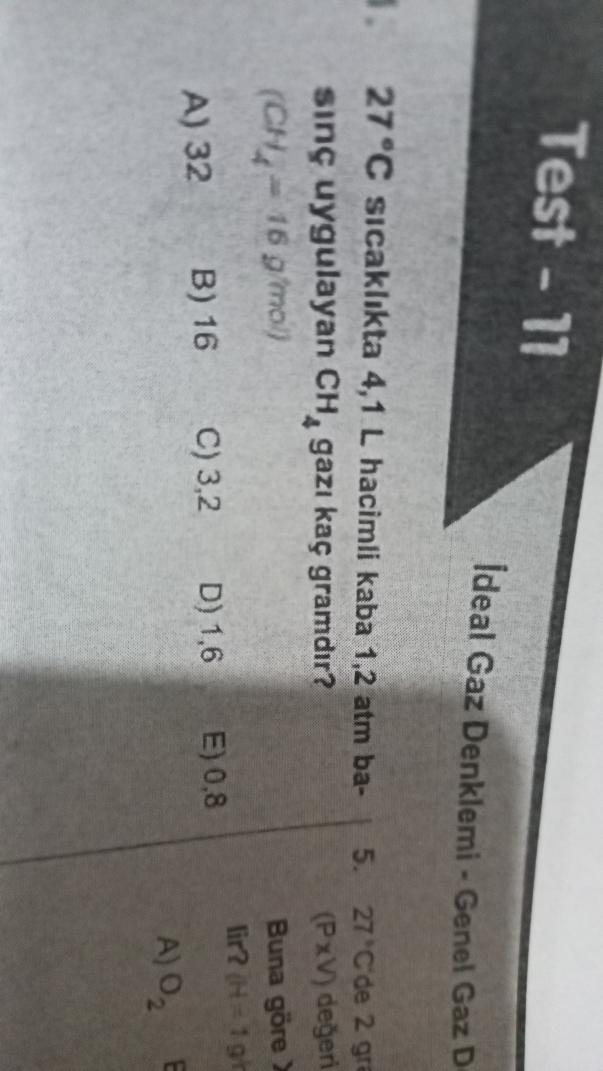 - 16 g → Bizim bulduğumuz değerin yaklaşık 5 katı; 1 mol gaz bile bu koşullarda bu kadar yer kaplamaz.