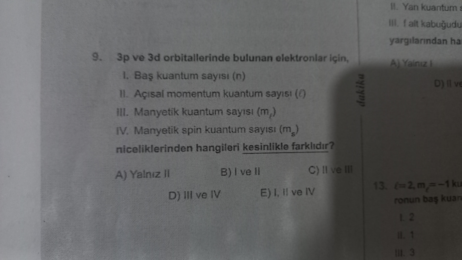 - Burada sınav mantığı açısından kesin farklı olan kuantum sayıları sorulduğunda, m_l genelde farklı kabul edilir, çünkü p ve d orbitallerinin yönlenmesi farklıdır.