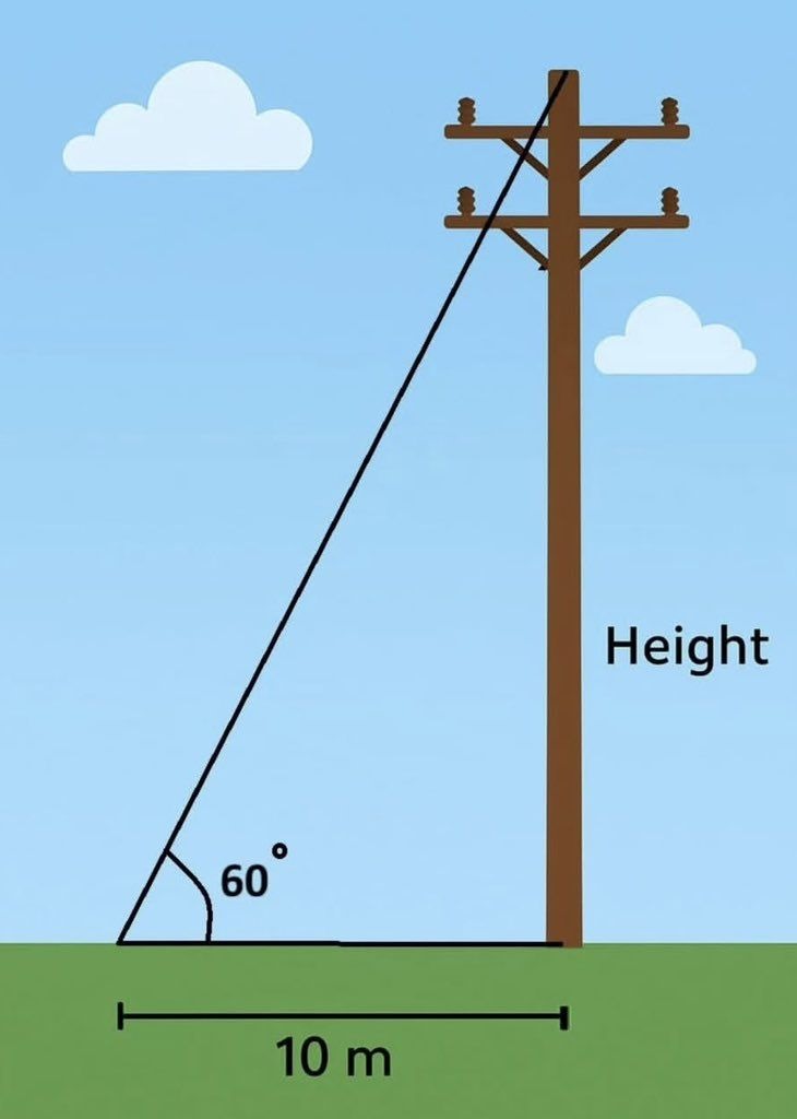 1.732 = \frac{h}{10} \implies h = 10 \cdot 1.732 = 17.32\,\text{metre}
