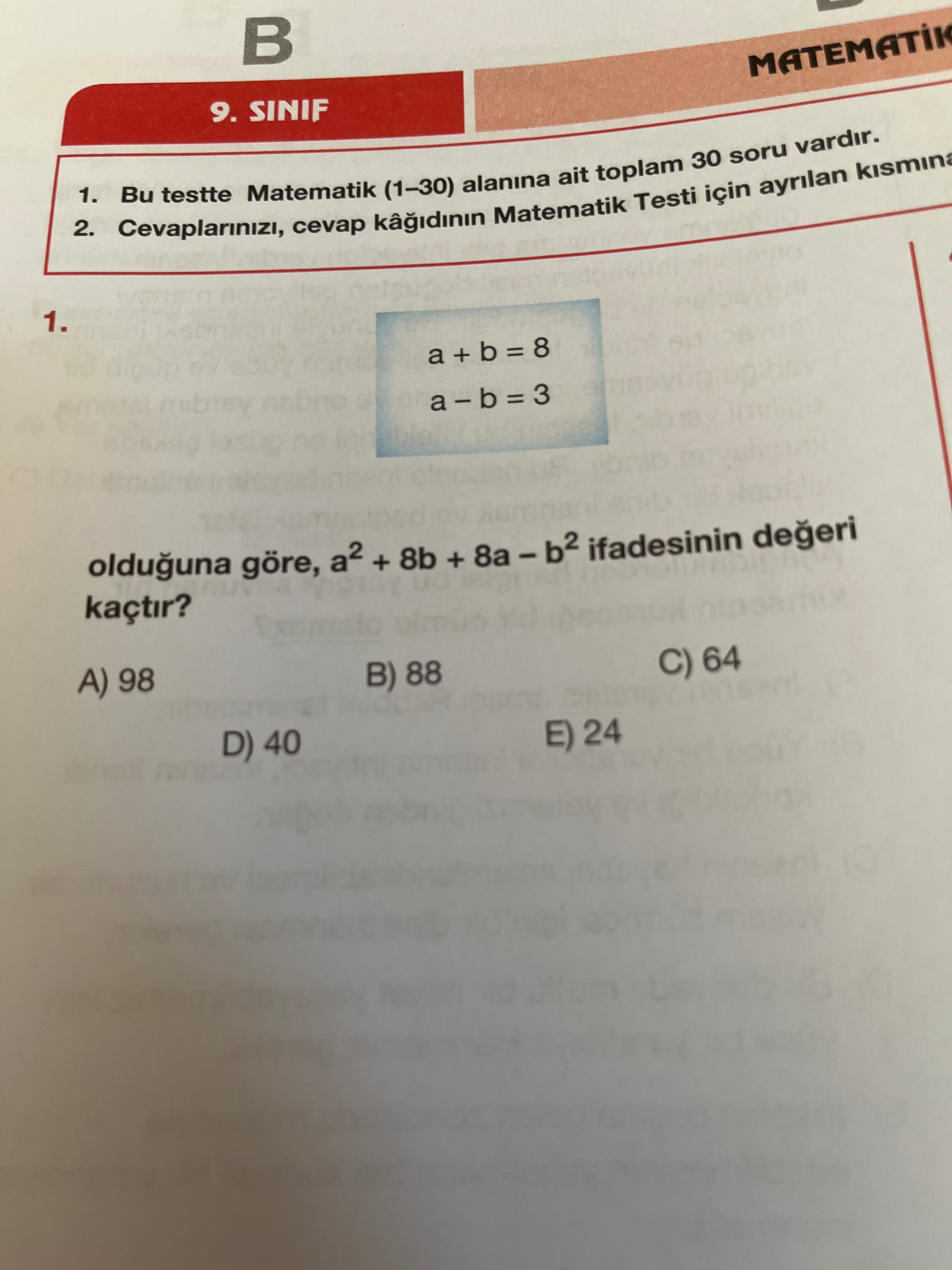 a^{2} + 8b + 8a - b^{2} değil, a^{2} + 8b + 8a - b^{2} şeklinde görünse de test şıklarına göre doğru yorum: