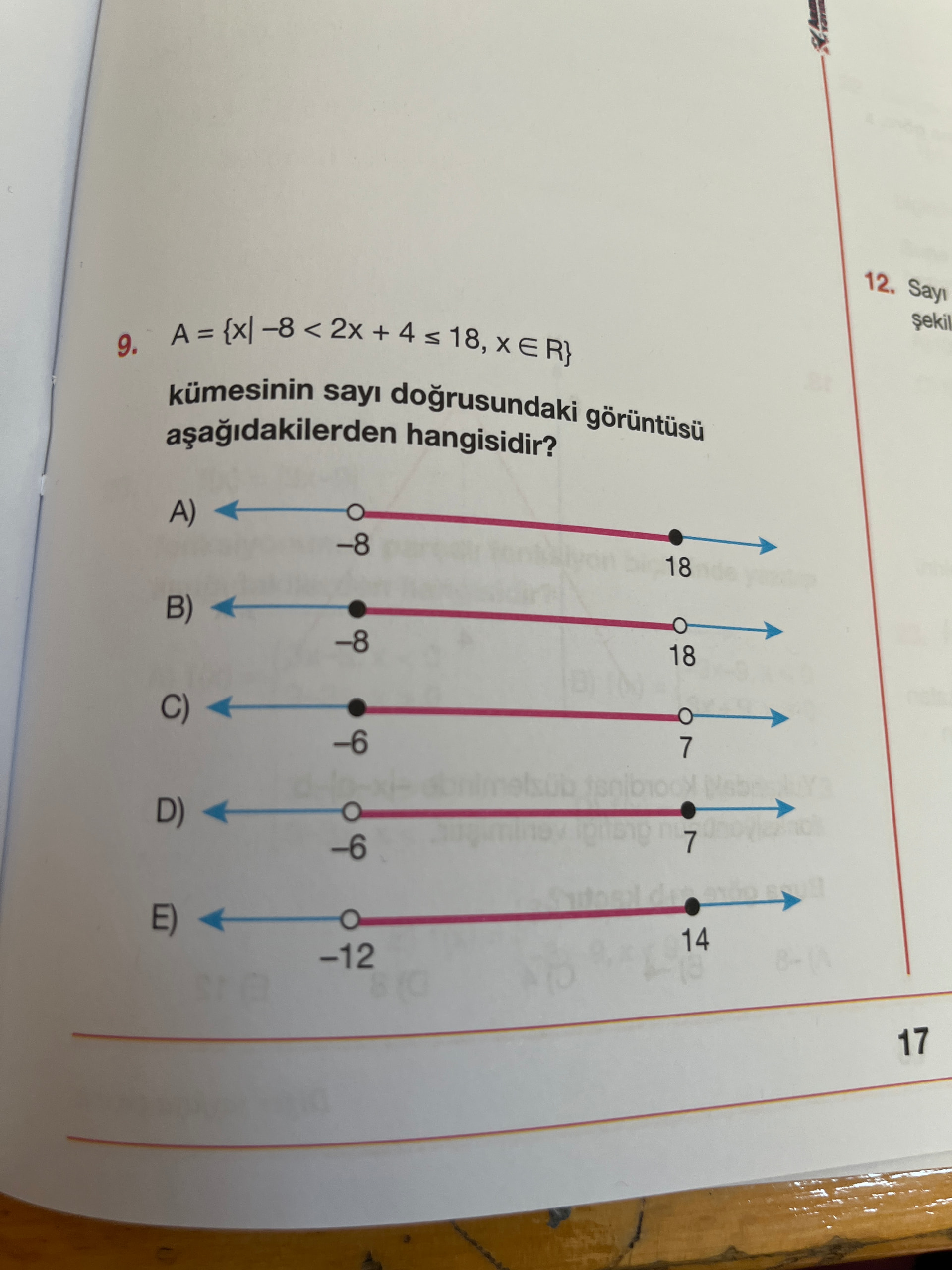 Kısa açıklama: Görsel, bir doğrusal eşitsizlikle tanımlanan kümenin sayı doğrusunda nasıl gösterileceğini sorgulayan bir çoktan seçmeli matematik sorusudur; seçenekler farklı uç noktalar ve açık/kapalı uçları temsil eder.