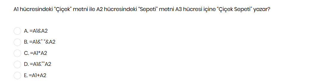 A1 hücresindeki “Çiçek” metni ile A2 hücresindeki “Sepeti” metni A3 hücresi içine “Çiçek Sepeti” yazar?
