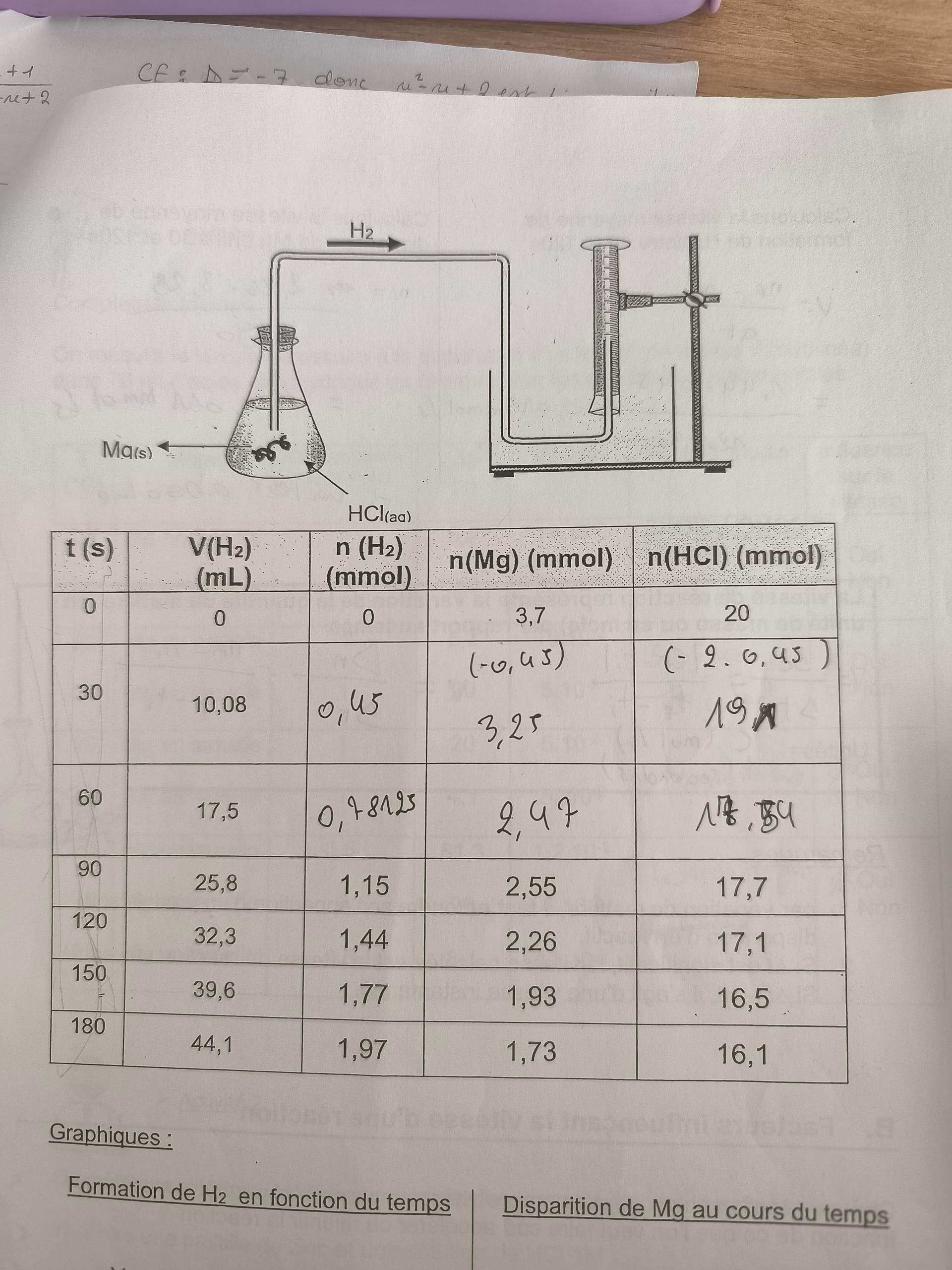 Le document montre un montage pour la réaction de Mg(s) avec HCl(aq) produisant du H2, ainsi qu’un tableau cinétique donnant, à différents temps, le volume de H2 formé et les quantités de matière correspondantes de H2, de Mg restant et de HCl restant; des indications manuscrites servent à illustrer les variations, et deux graphiques demandés portent sur la formation de H2 et la disparition de Mg au cours du temps.