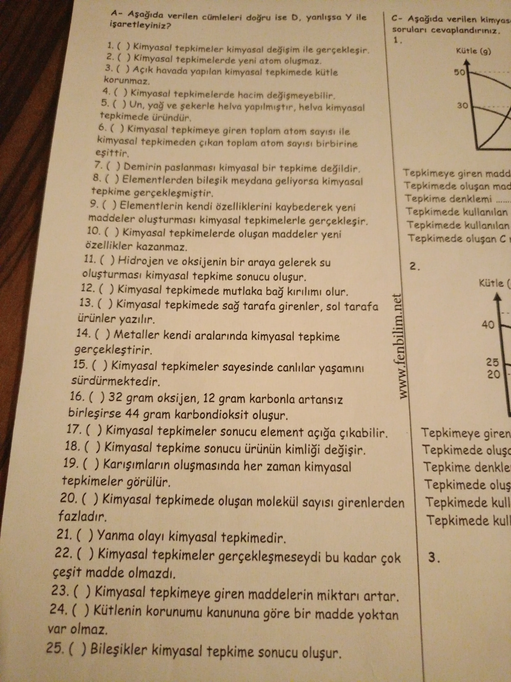 - ( ) Kimyasal tepkime sonucu ürünün kimliği değişir.