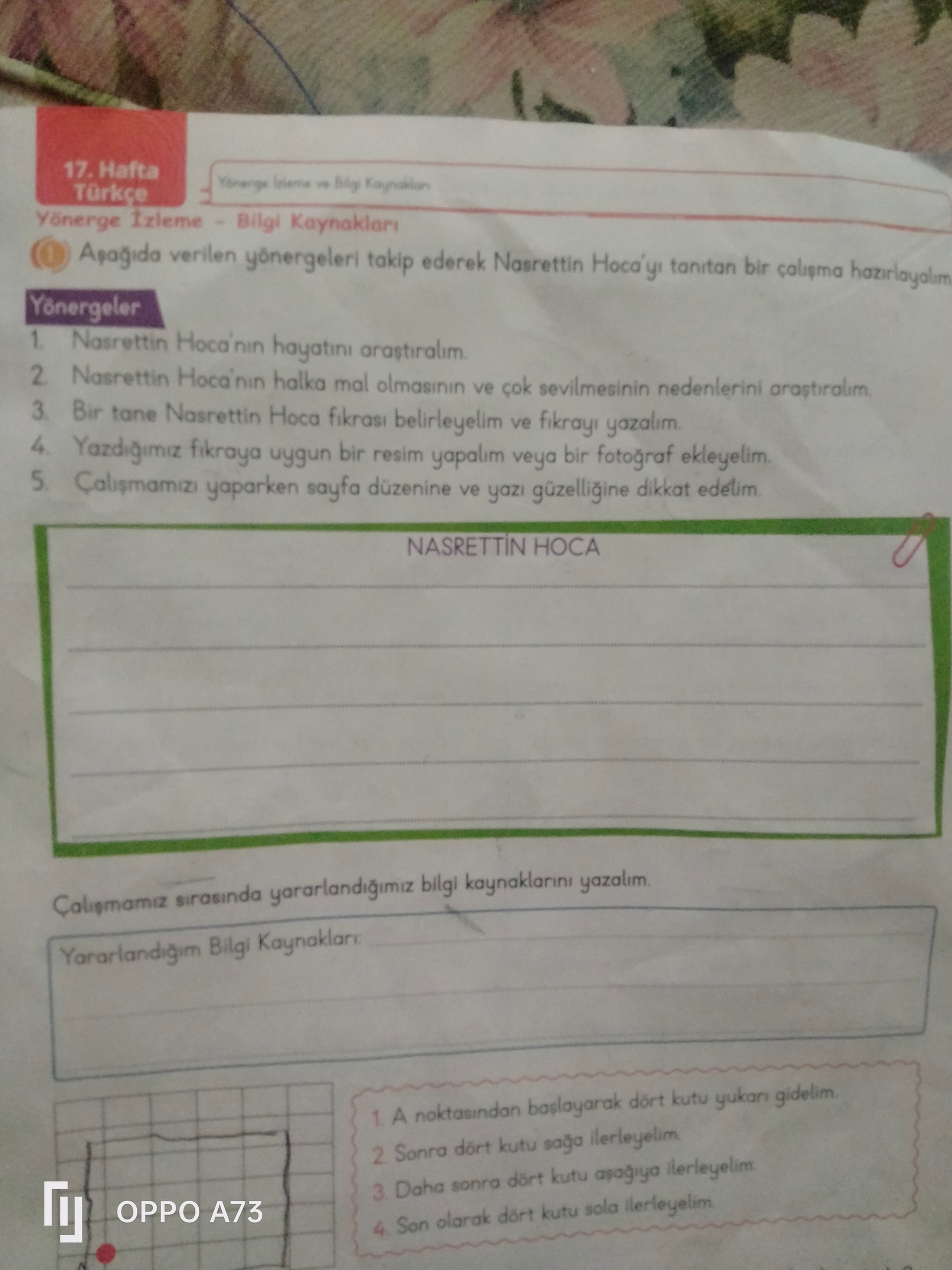 Özet: Sayfa, Nasrettin Hoca’yı tanıtan bir çalışma hazırlamak için araştırma ve yazma yönergeleri, başlıklı boş yazı alanı ve yararlanılan kaynaklar bölümü içeriyor; ayrıca kareli zeminde adım adım yönlendirme etkinliği yer alıyor.