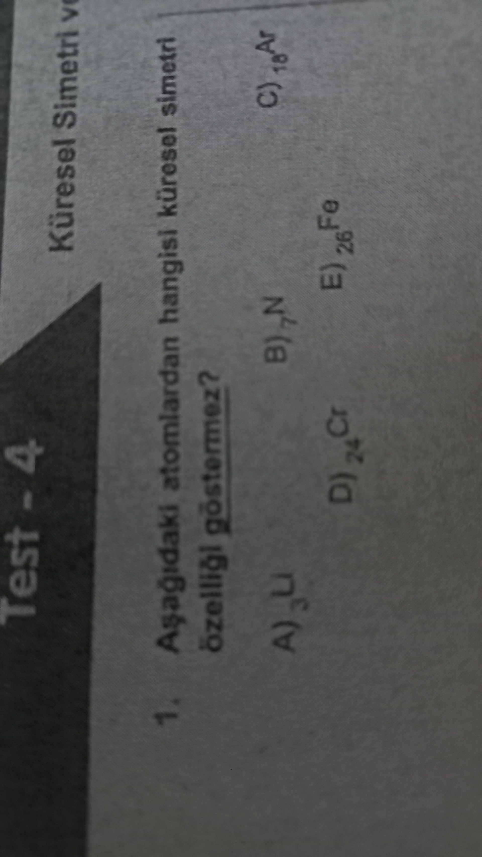 Genel olarak: Görsel bir kimya testinden alınmış, “küresel simetri” özelliğini sormayan/ister nitelikte çoktan seçmeli bir soru ve seçeneklerde çeşitli elementler yer alıyor.