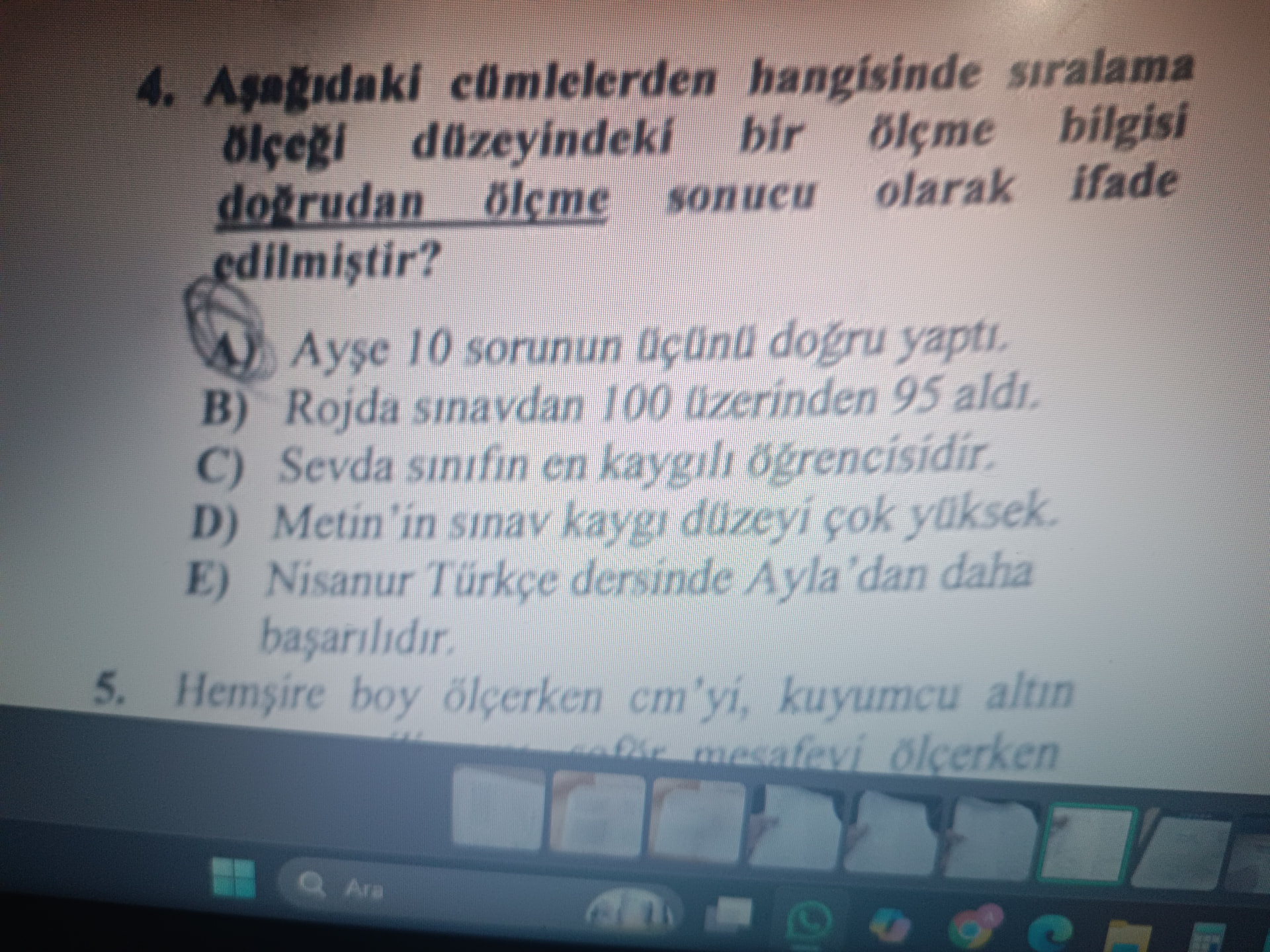 - B) Rojda’nın 100 üzerinden 95 alması kesin (doğrudan aritmetik ölçme), sıralama değil.