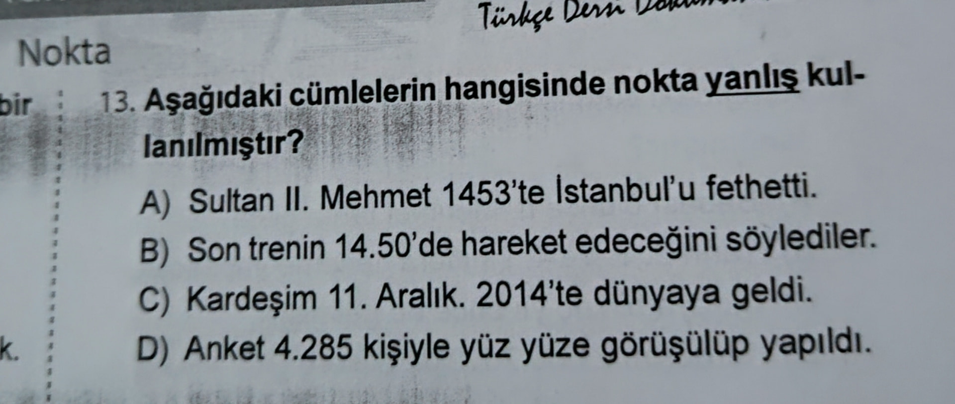 Bu görsel, Türkçede nokta işaretinin doğru kullanımıyla ilgili çoktan seçmeli bir soru içermektedir.