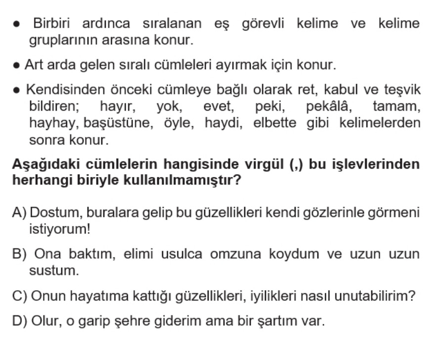 - D şıkkı: “Olur, o garip şehre giderim ama bir şartım var.” cümlesinde “olur” kelimesinden sonra virgül var, bu da ret, kabul, teşvik bildiren kelimeden sonra geldiği için yukarıda belirtilen işlevlerden birine uyar.