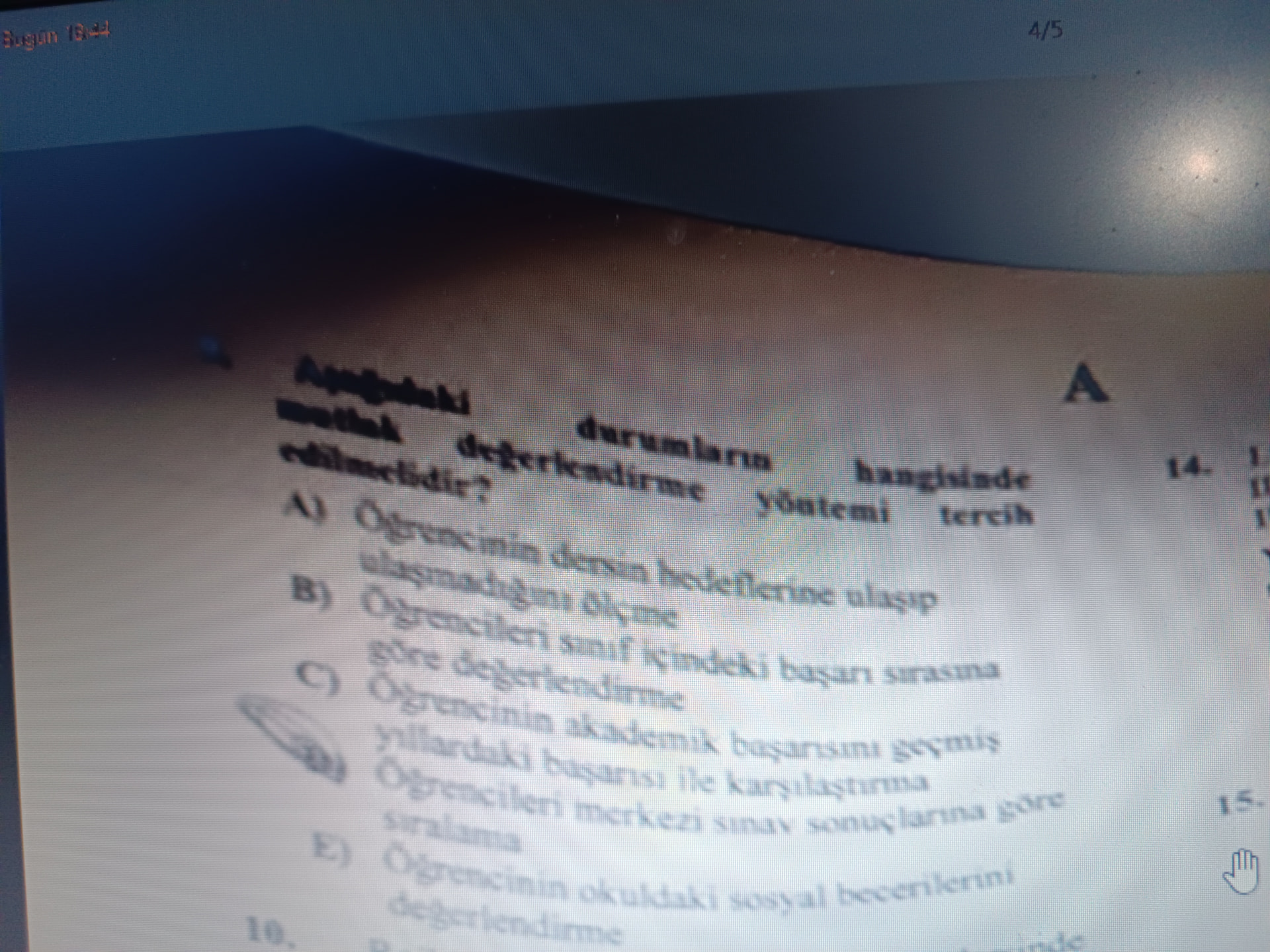 Genel açıklama: Görsel, eğitimde ölçme ve değerlendirme konulu bir çoktan seçmeli soruyu içeriyor ve farklı değerlendirme yaklaşımlarının hangi durumlarda tercih edileceğine odaklanıyor.