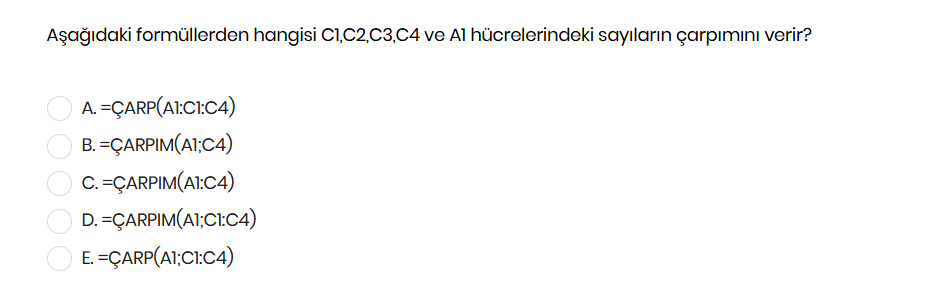 Bu soruda, A1, C1, C2, C3 ve C4 hücrelerindeki sayıları çarpmak için doğru formül soruluyor.