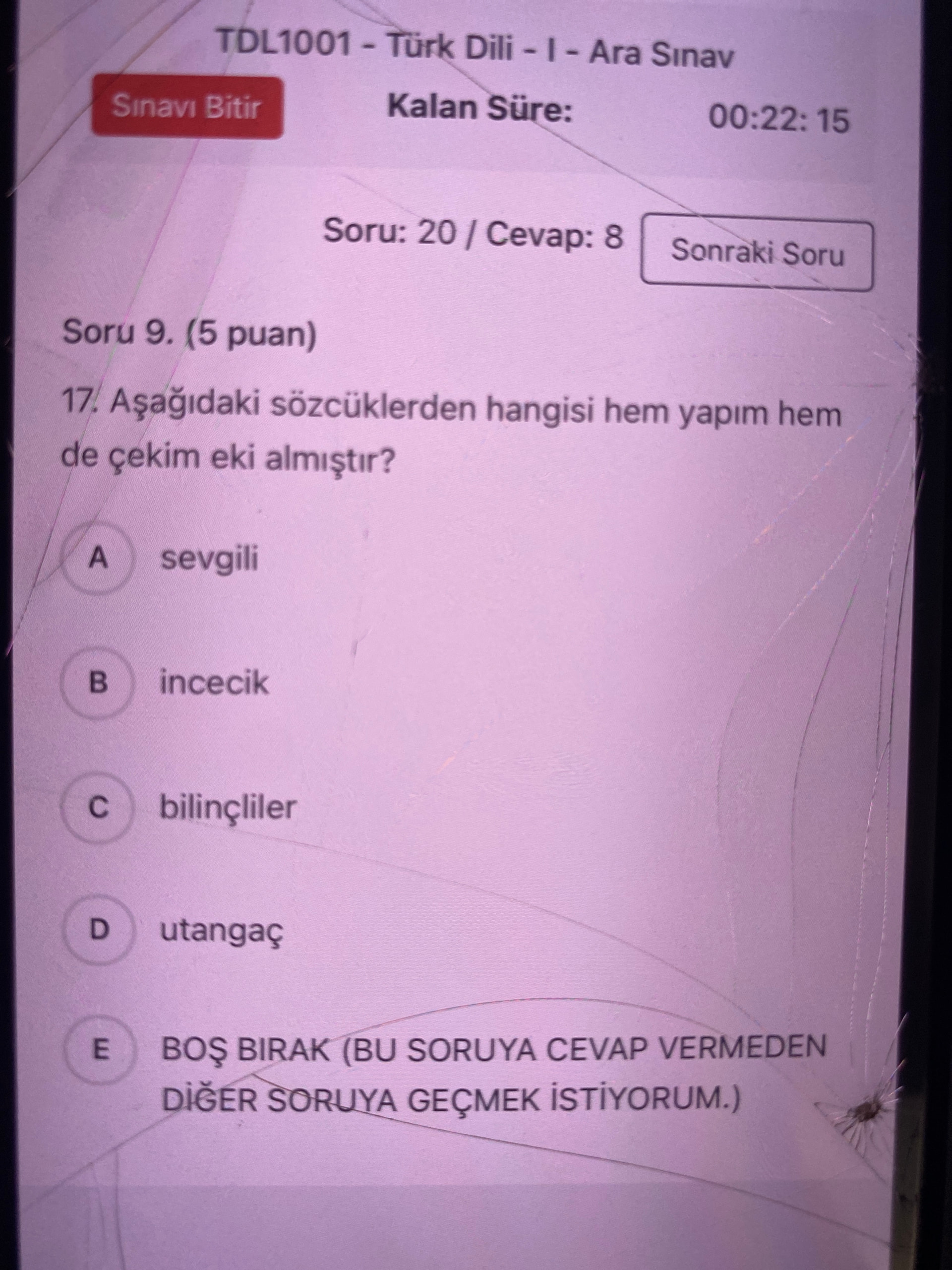 Genel açıklama: Görsel, Türk Dili I dersinin çevrim içi ara sınav ekranından bir soru sayfasını gösteriyor; soru, sözcüklerin yapım ve çekim ekleriyle ilgili dil bilgisi bilgisini ölçüyor.