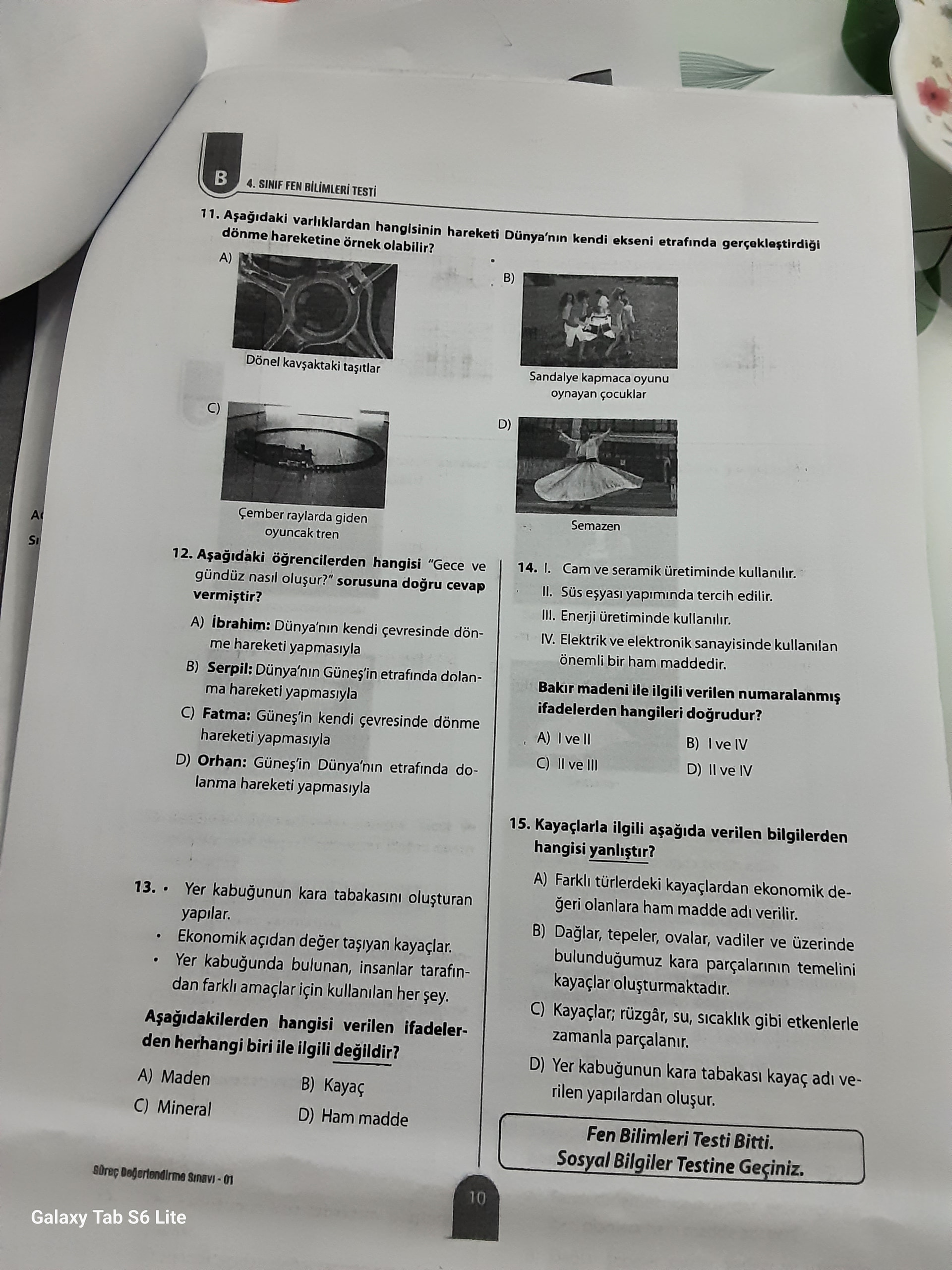 Genel açıklama: Görsel, 4. sınıf fen bilimleri testinin bir sayfasıdır. Dünyanın dönme ve dolanma hareketi, gece-gündüz oluşumu, kayaçlar ve madenler (özellikle bakırın kullanım alanları) konularında çoktan seçmeli sorular içerir.