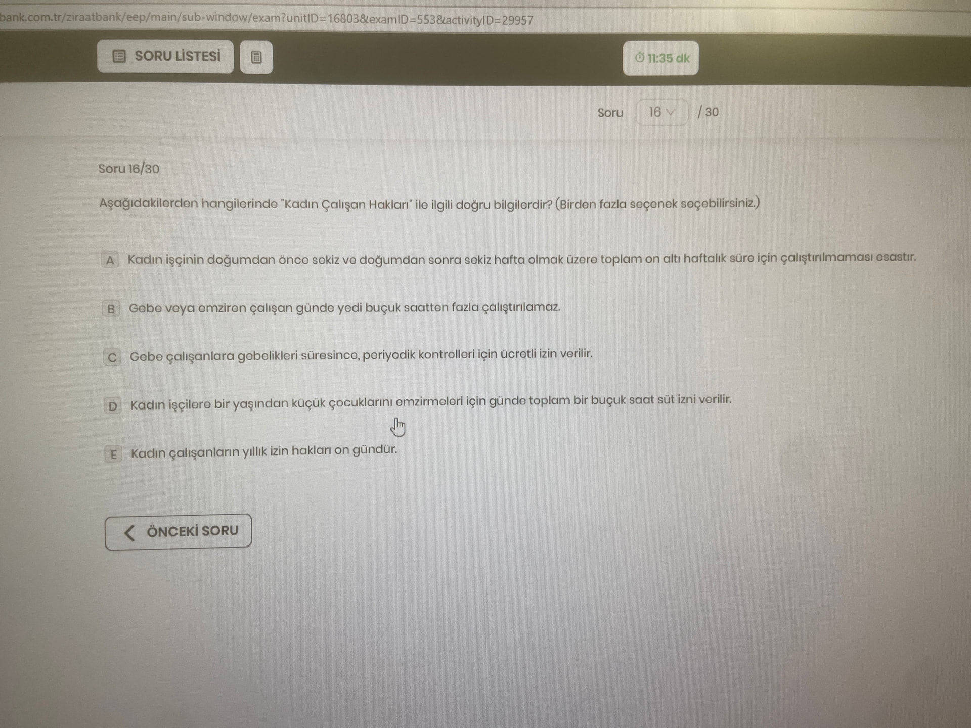 Aşağıdakilerden hangilerinde “Kadın Çalışan Hakları” ile ilgili doğru bilgilerdir? (Birden fazla seçenek seçebilirsiniz.)