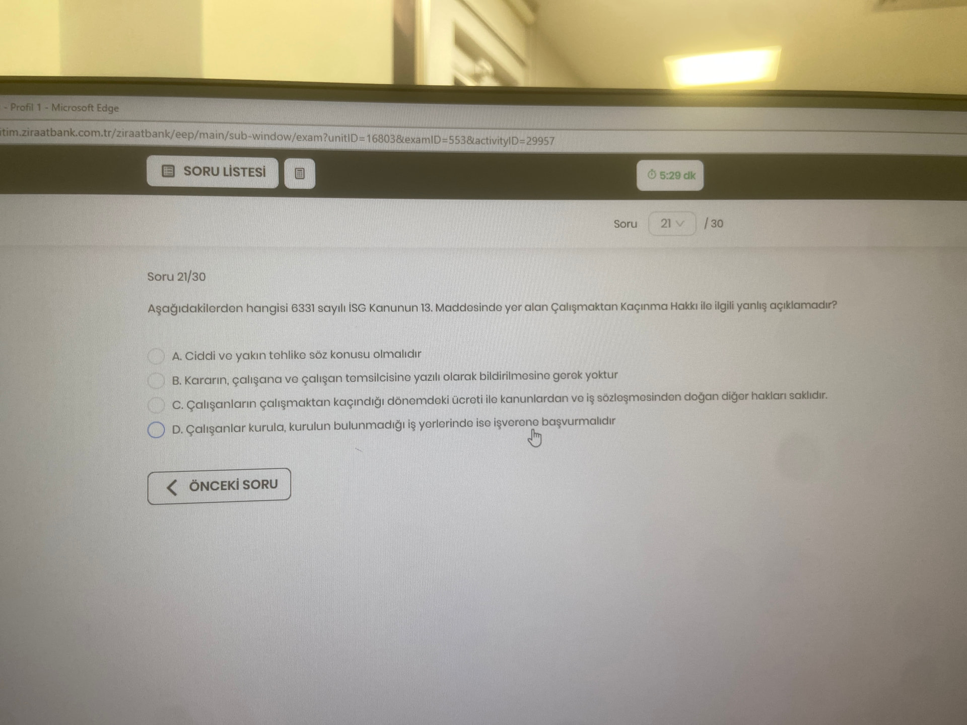 Görüntü, çevrim içi bir sınav ekranında 6331 sayılı İş Sağlığı ve Güvenliği Kanunu’nun 13. maddesindeki “çalışmaktan kaçınma hakkı” konulu çoktan seçmeli bir soruyu göstermektedir.