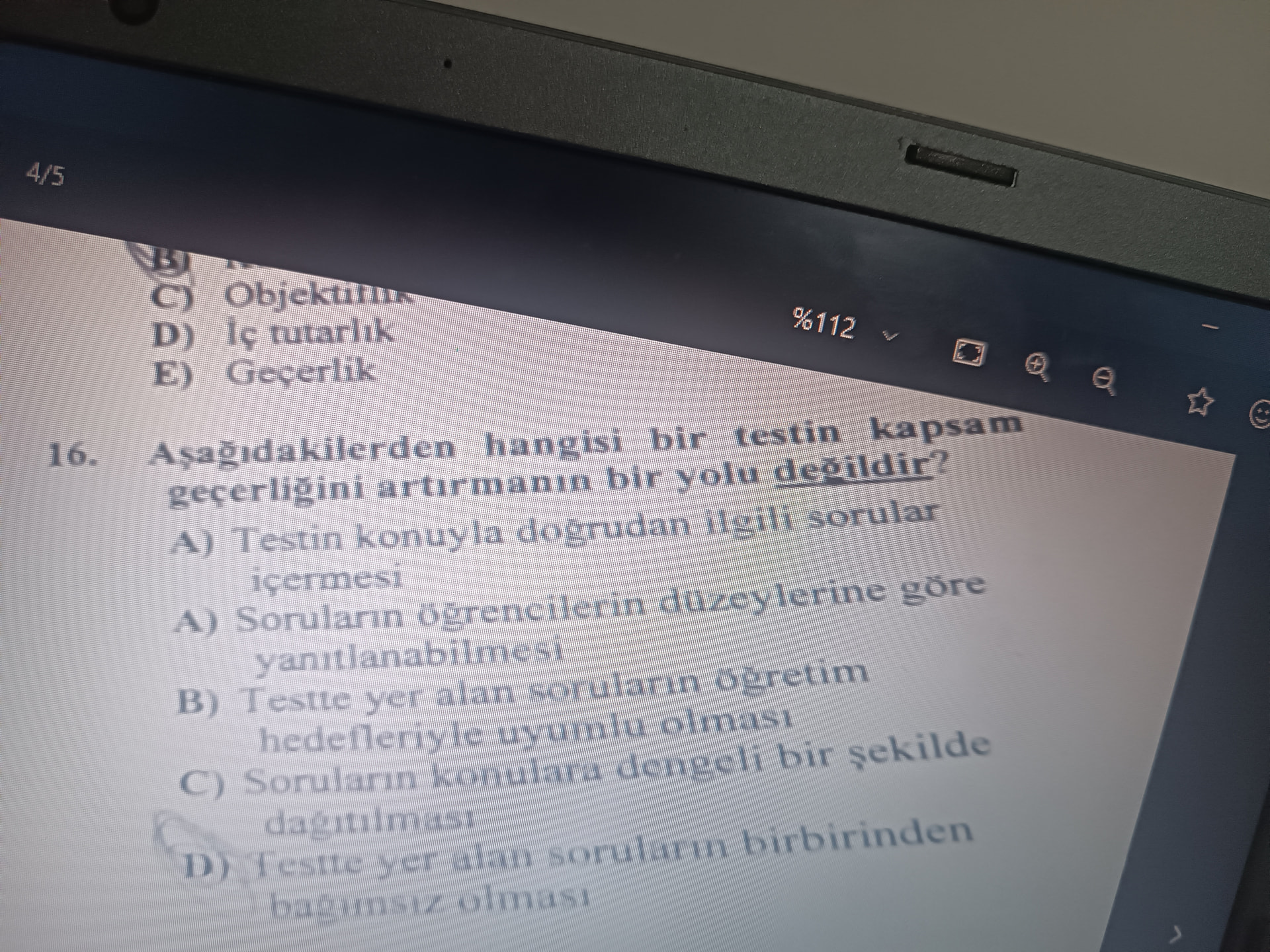 Genel açıklama: Görsel, eğitimde ölçme ve değerlendirme konusuna ait çoktan seçmeli bir sınav sayfasını içeriyor; özellikle kapsam geçerliği ve ölçme ilkeleriyle ilgili seçenekler yer alıyor.