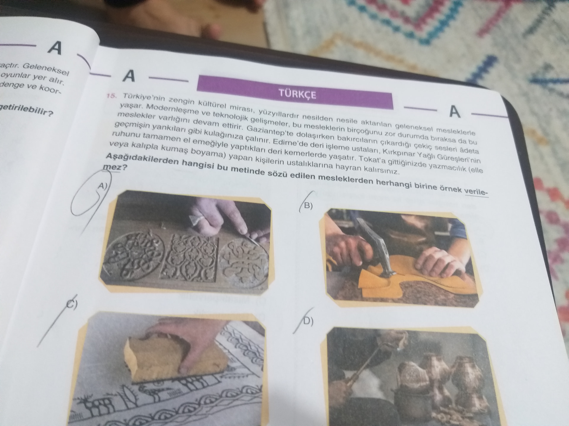 Genel açıklama: Görsel, Türkçe dersinde Türkiye’nin geleneksel el sanatları ve meslekleri (bakırcılık, deri işleme, yazmacılık vb.) konulu bir çoktan seçmeli soruyu ve bu mesleklere ilişkin görsel seçenekleri içermektedir.