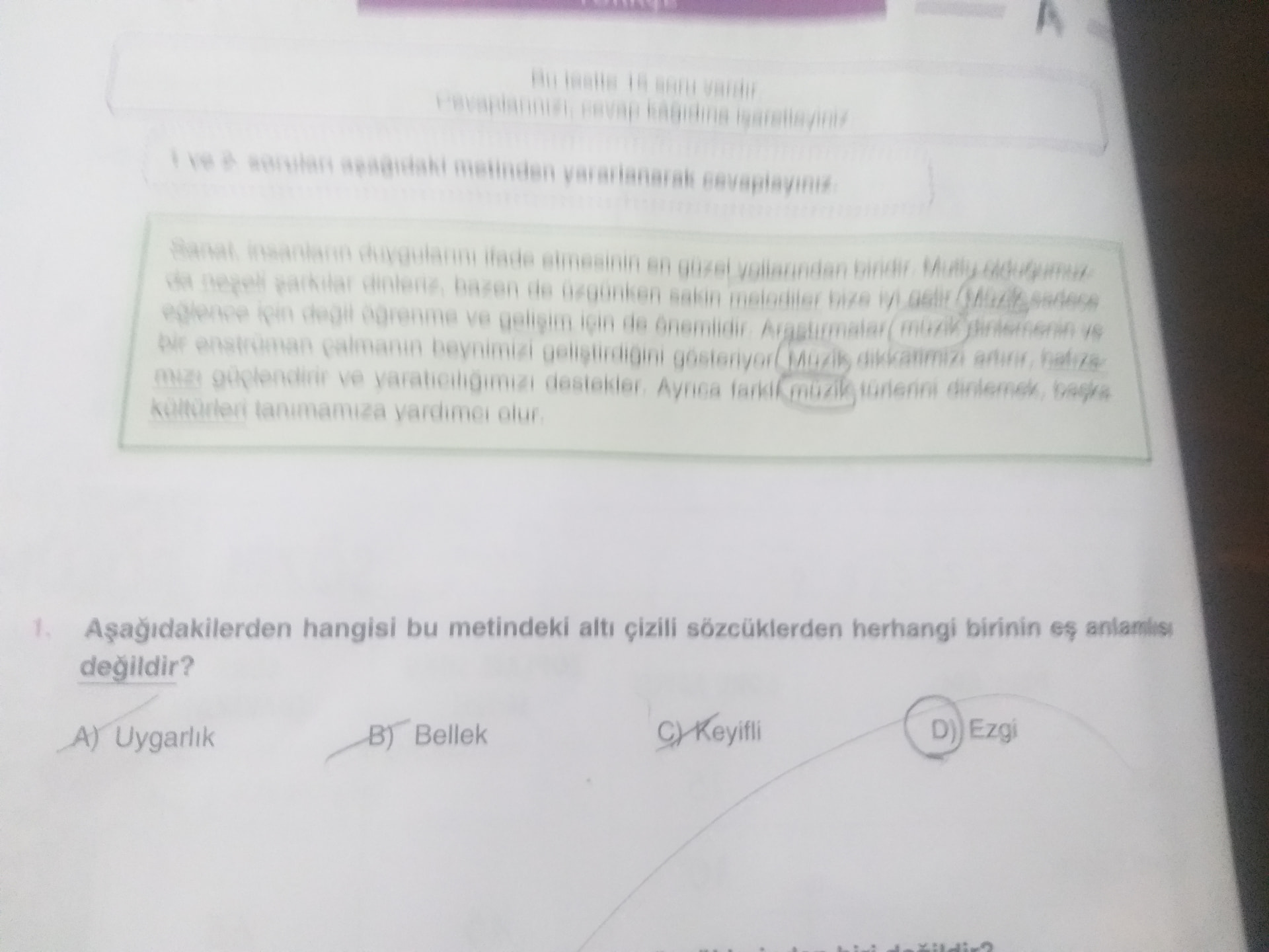 Metindeki altı çizili kelimelerle (medeniyet, bellek, müzik, keyifli) “Ezgi” kelimesinin eş anlamı yoktur.