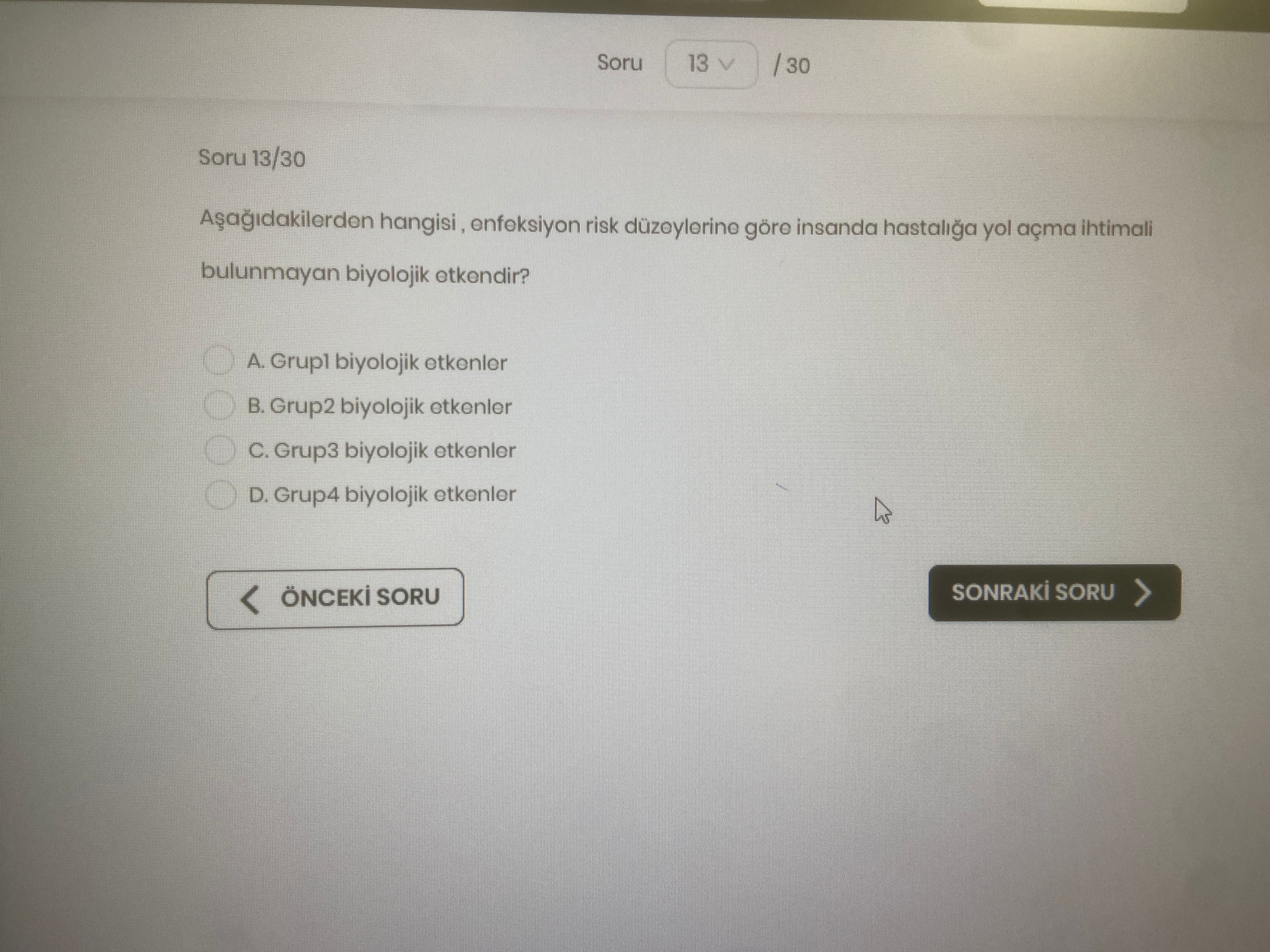 Genel açıklama: Görsel, bir sınav/quiz arayüzünde biyolojik etkenlerin enfeksiyon risk gruplarıyla ilgili çoktan seçmeli bir soruyu göstermektedir.
