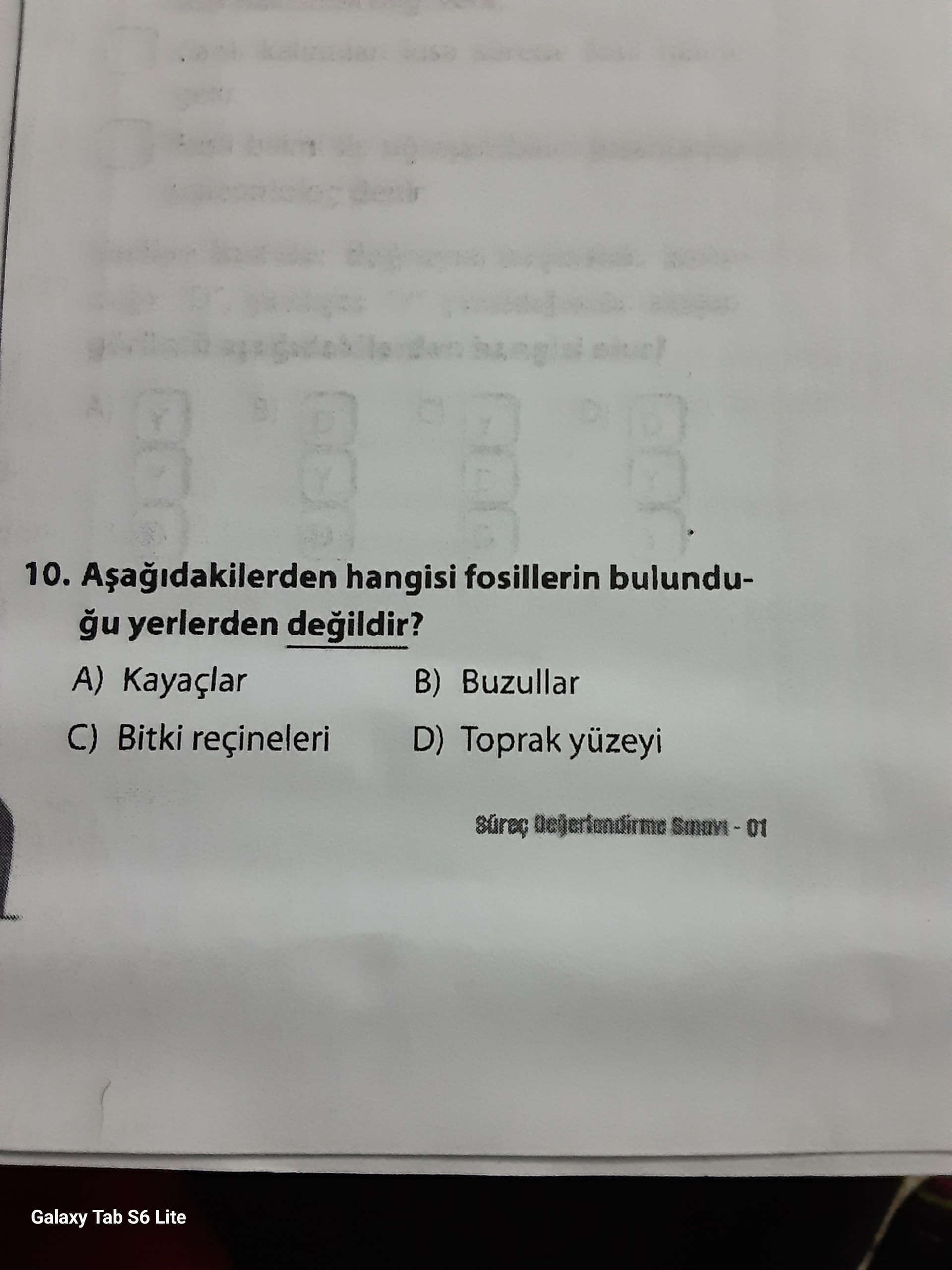 - D) Toprak yüzeyi: Doğrudan yüzeyde fosil bulunmaz; çünkü açıkta kalan kalıntılar hızla yok olur.