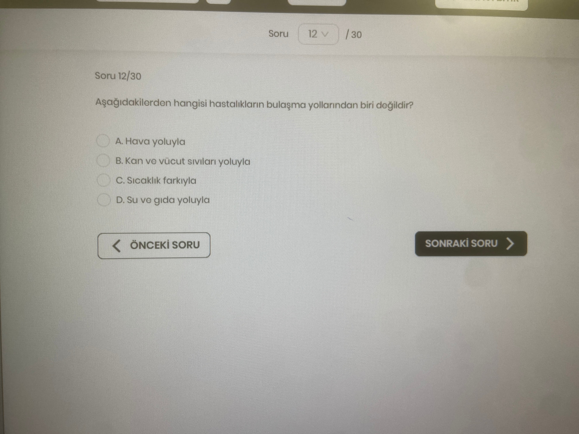 Bu yüzden bulaşma yolu olmayan seçenek C şıkkıdır.