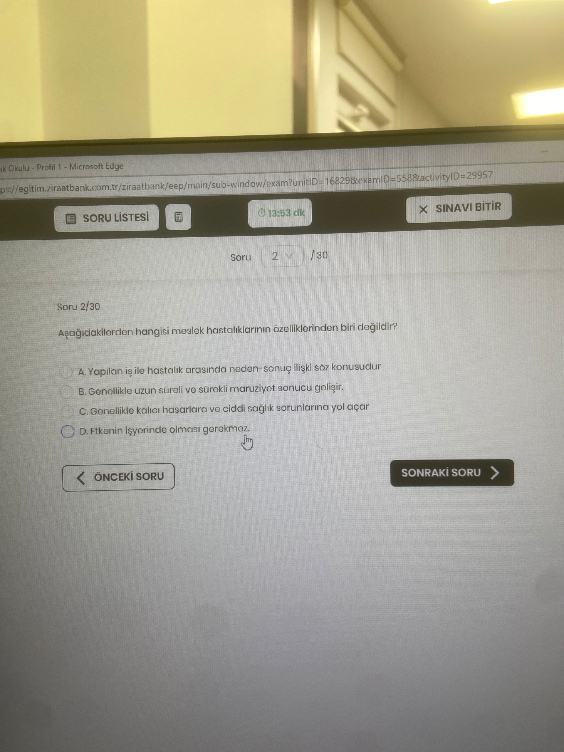 Şıklardaki ifadelerin net görünmeyen kısımları olsa da, meslek hastalıklarıyla ilgili temel bilgilerden gidelim: