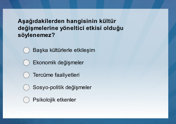 Tüm görsellerin özeti: İçerik, kültürel değişimleri etkileyen faktörleri sorgulayan çoktan seçmeli bir test sorusundan oluşmaktadır.