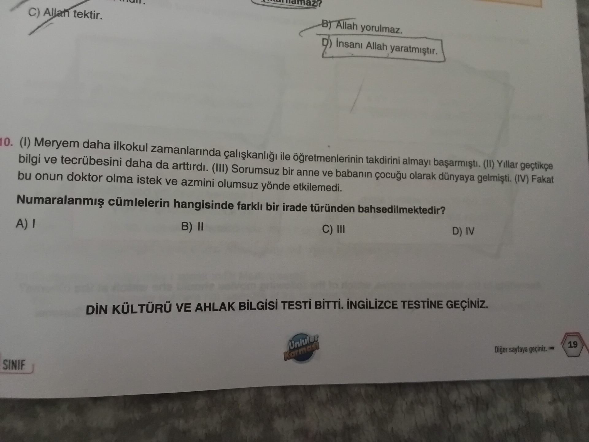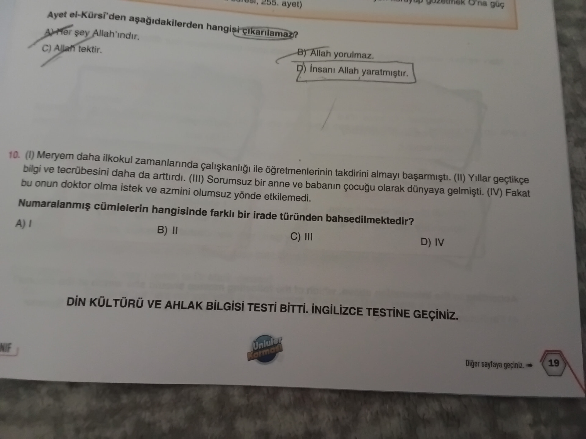 DİN KÜLTÜRÜ VE AHLAK BİLGİSİ TESTİ BİTTİ. İNGİLİZCE TESTİNE GEÇİNİZ.