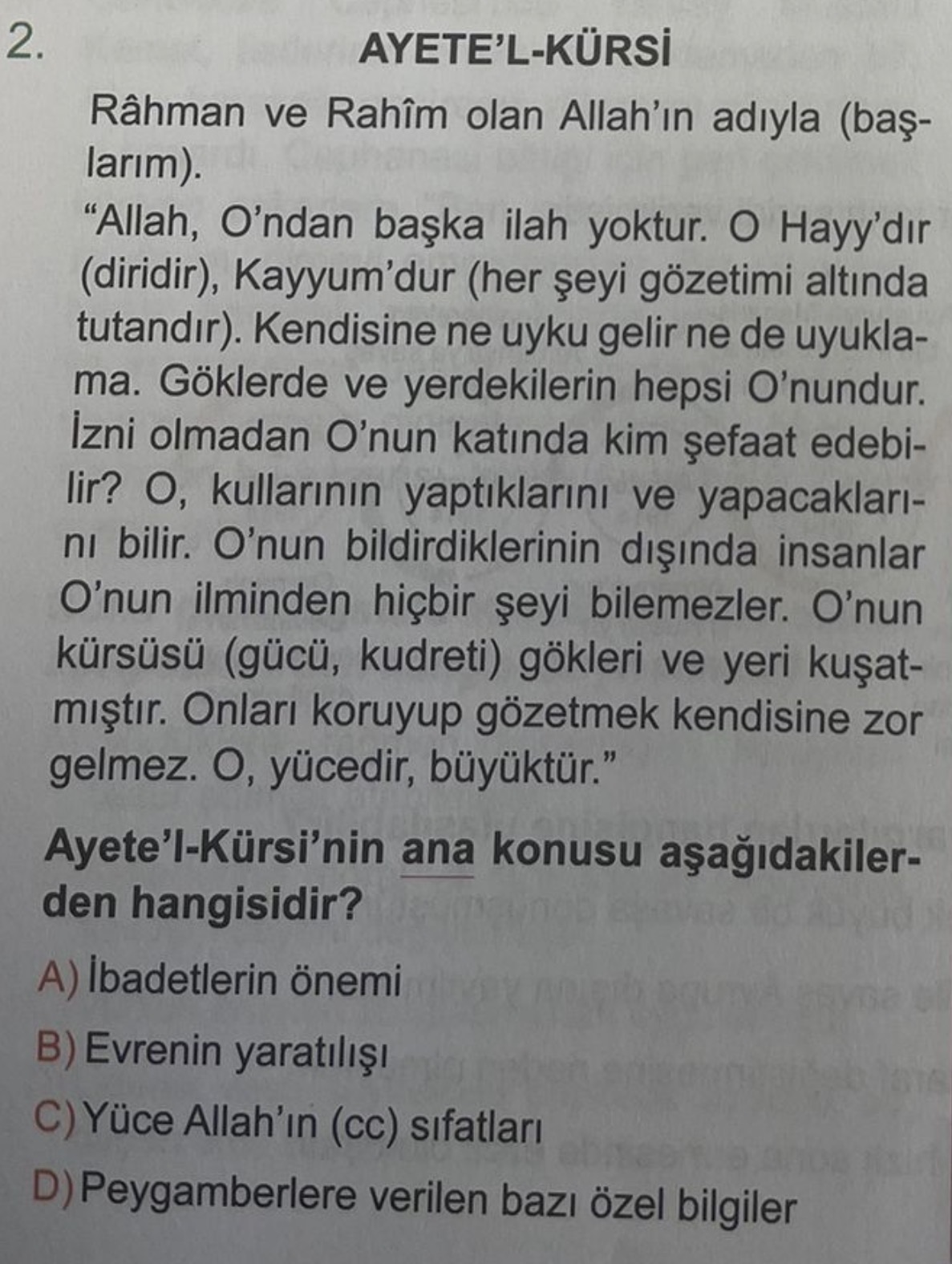 Doğru cevap: C) Yüce Allah’ın (cc) sıfatları
