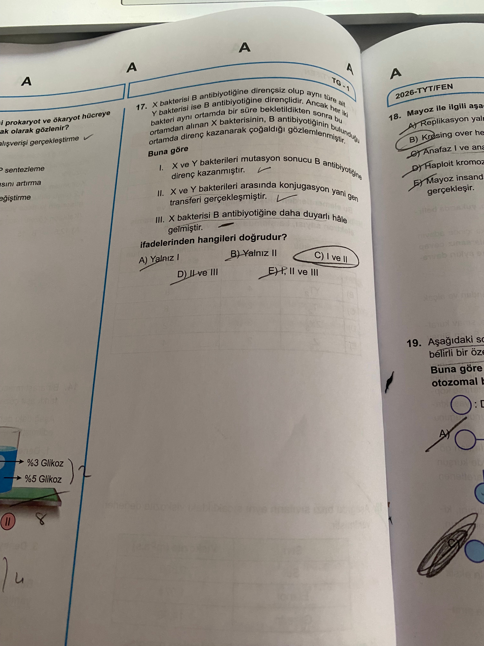 Görüntü, TYT/Fen tarzı bir test sayfası. Bakterilerde antibiyotik direnci ve gen aktarımı (konjugasyon) ile ilgili bir soru, mayoz bölünme hakkındaki kavramlar ve glikoz derişimlerinin bulunduğu bir görsel yer alıyor.