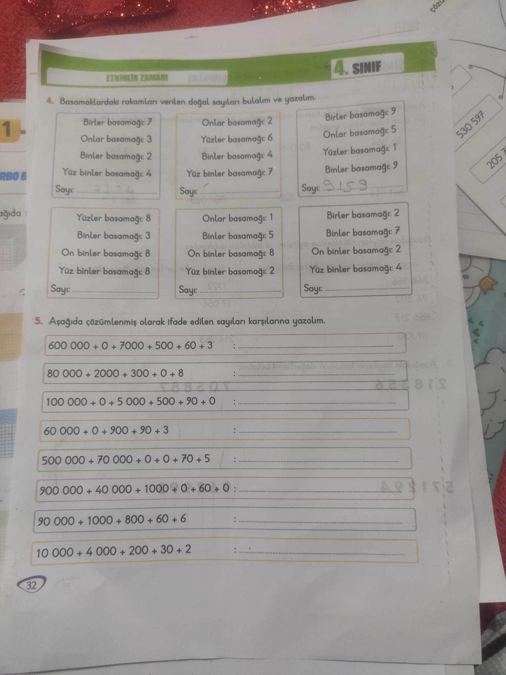 Açıklama: Bu sayfa, 4. sınıf seviyesinde bir matematik etkinliği içermektedir. Sayfa, basamak değeri verilen doğal sayıları bulmayı ve çözümlemiş sayıları normal formatta yazmayı amaçlayan etkinlikler içermektedir.