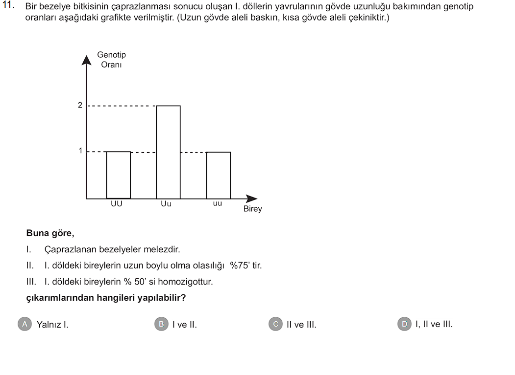 Açıklama: Grafikte genotip oranı UU:Uu:uu = 1:2:1 görülüyor; bu, ebeveynlerin heterozigot (Uu × Uu) olduğunu ve dolayısıyla melez olduğunu (I doğru) gösterir. Uzun gövde fenotipi UU ve Uu tarafından verildiğinden uzun olma olasılığı 3/4 = 75\% (II doğru), homozigot bireyler UU ve uu toplamı 2/4 = 50\% (III doğru).