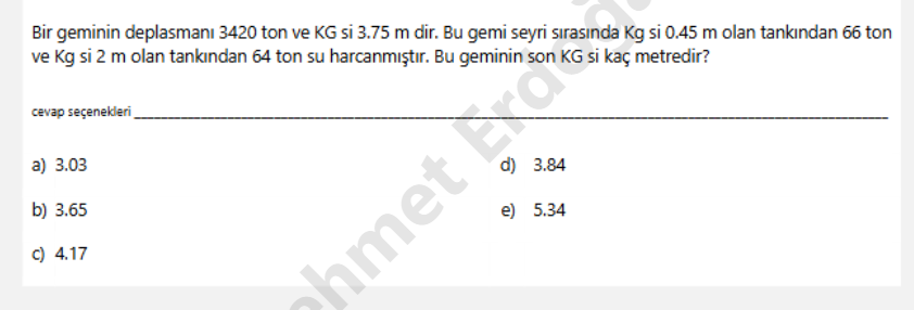 Bir geminin deplasmanı 3420 ton ve KG si 3.75 m dir. Bu gemi seyri sırasında Kg si 0.45 m olan tankından 66 ton ve Kg si 2 m olan tankından 64 ton su harcanmıştır. Bu geminin son KG si kaç metredir?