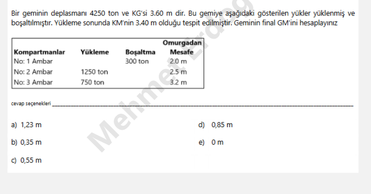 Bu metin bir geminin yükleme ve boşaltma işlemleri sonrası GM (Metasentrik Yüksekliği) hesaplama sorusunu içermektedir. Gemiye yüklenen ve boşaltılan yüklerin miktarları ve omurgadan mesafeleri verilmiştir. Bu bilgiler kullanılarak geminin son GM değeri bulunacaktır. Cevap seçenekleri de belirtilmiştir.