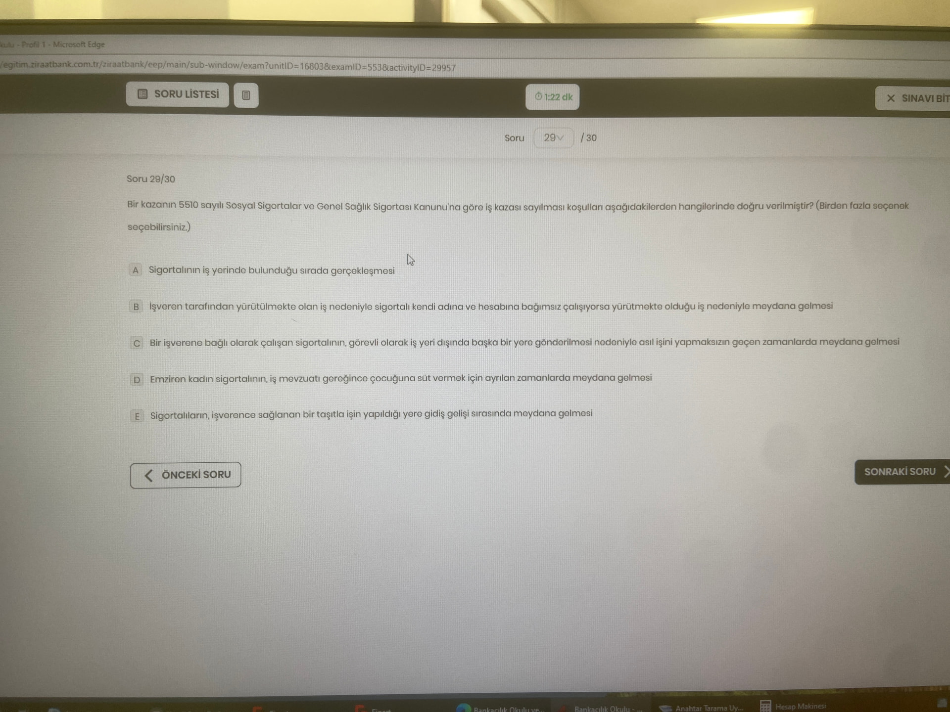Görüntü, çevrim içi bir sınav ekranında 5510 sayılı Sosyal Sigortalar ve Genel Sağlık Sigortası Kanunu’na göre iş kazasının hangi durumlarda sayılacağına ilişkin çoktan seçmeli bir soruyu içermektedir.
