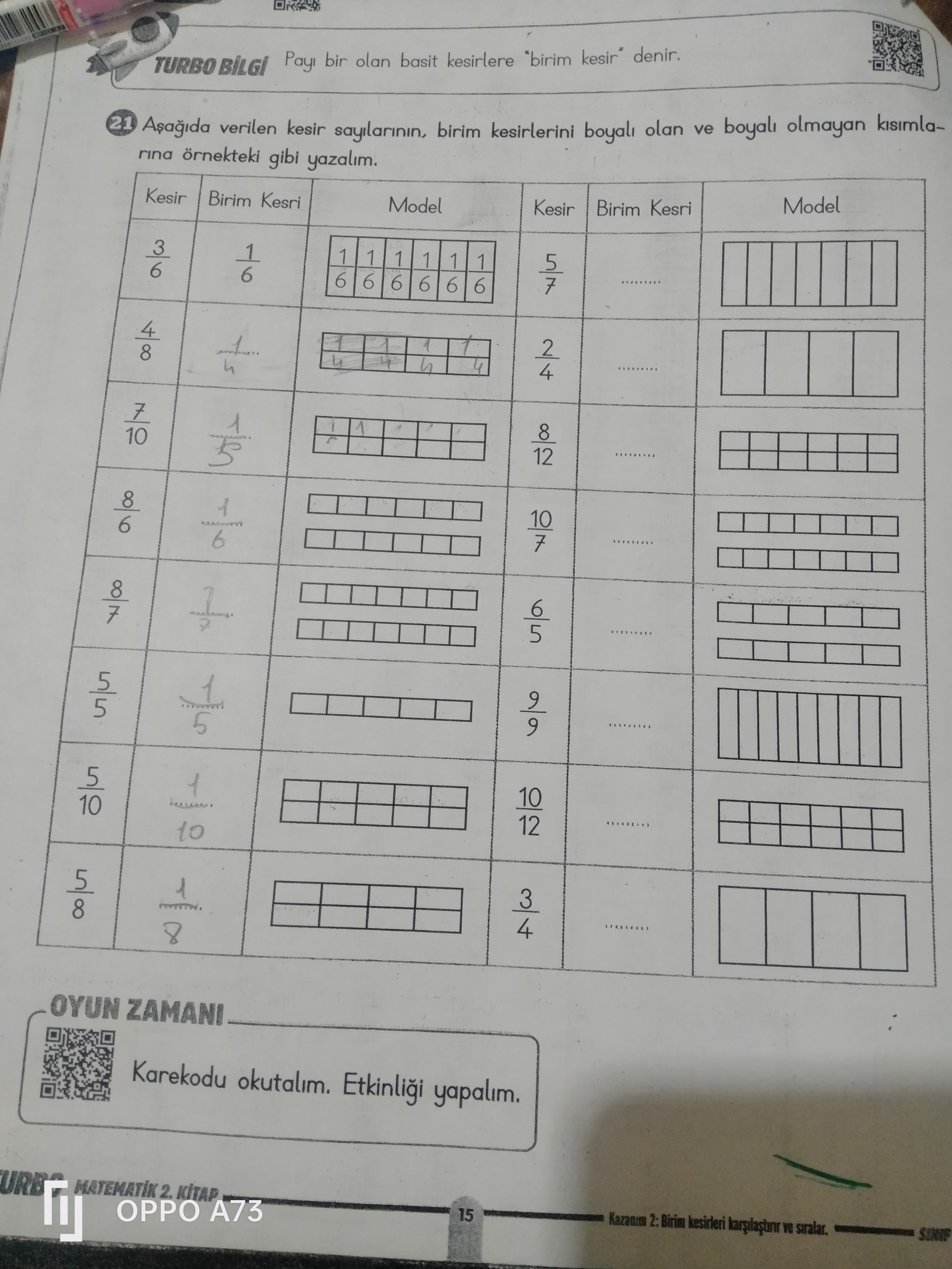 Özet: Sayfa, “birim kesir” tanımını verir ve iki sütunlu bir tabloda çeşitli kesirler için birim kesri yazma ile modelleme (boyalı-boyalı olmayan kısımlar) etkinliği içerir. Bazı alanlar öğrencinin doldurması için boştur; altta karekodlu etkinlik duyurusu ve sayfa bilgileri bulunur.