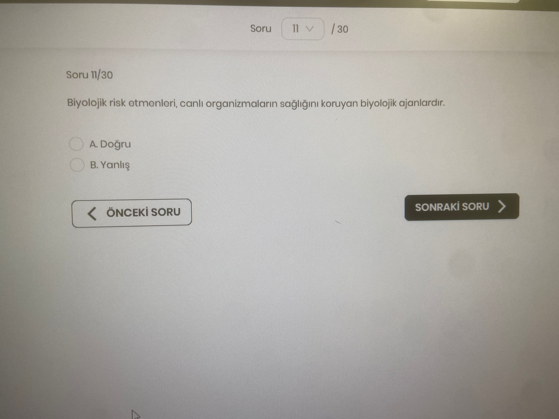 Genel açıklama: Görsel, biyolojik risk etmenleriyle ilgili doğru-yanlış biçiminde bir sınav/quiz sorusunu içeren bir test ekranını göstermektedir.
