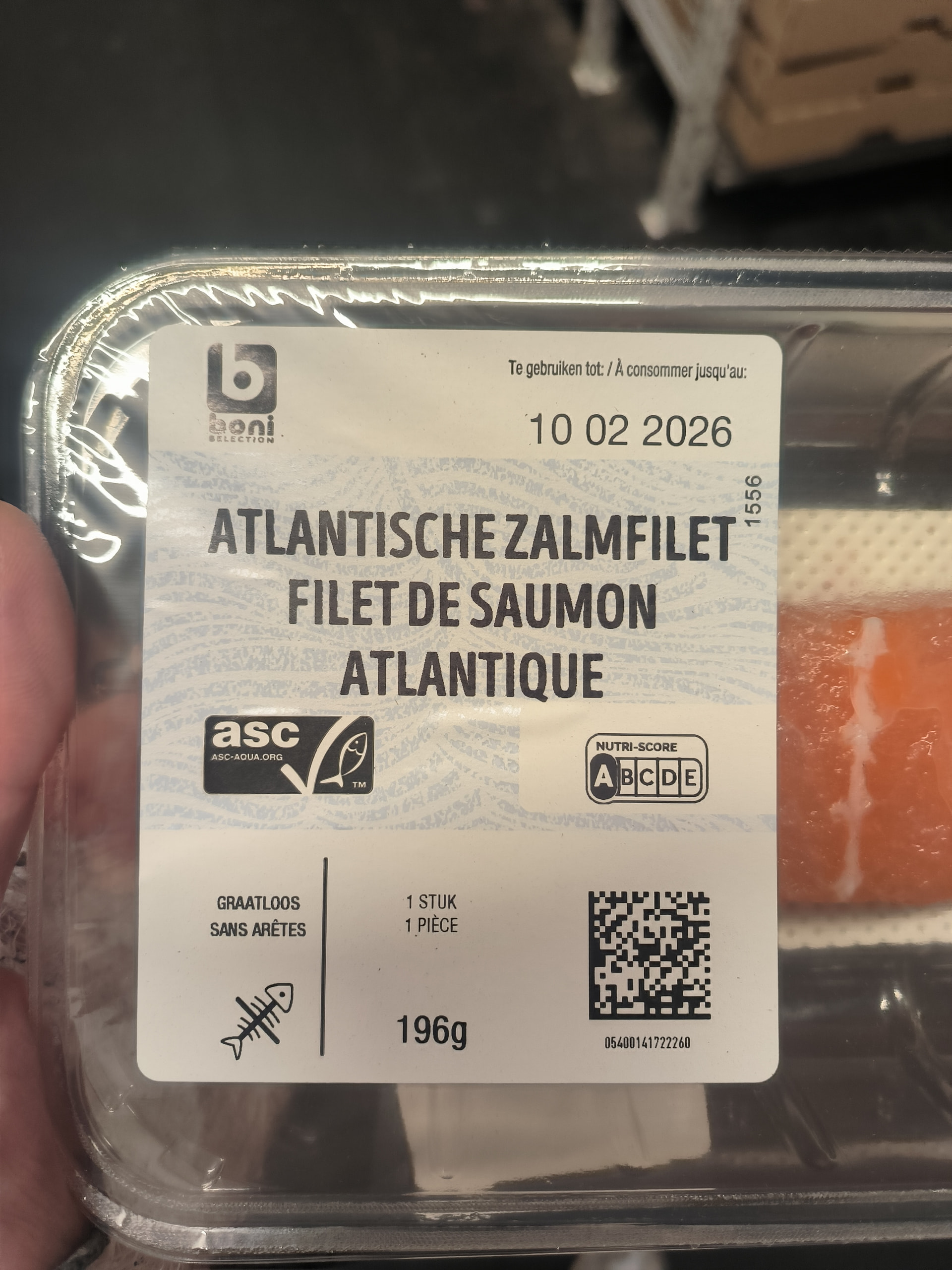 Özet: Verpakking van boni selection Atlantische zalmfilet, graatloos, 1 stuk (196g), Te gebruiken tot 10 02 2026, met ASC-label en Nutri-Score. / Emballage de filet de saumon atlantique boni selection, sans arêtes, 1 pièce (196g), À consommer jusqu’au 10 02 2026, avec label ASC et Nutri-Score.