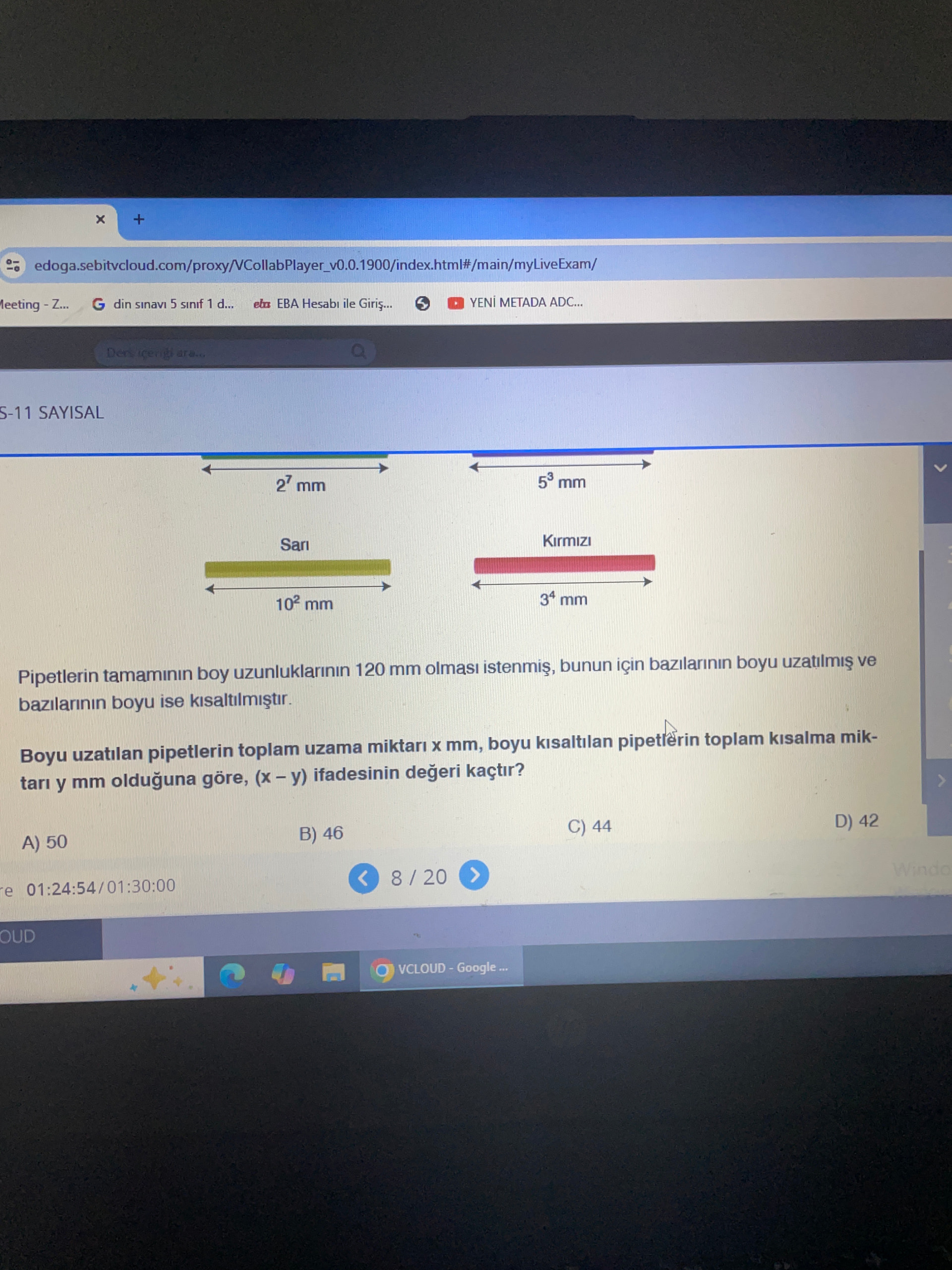 Boyu uzatılan pipetlerin toplam uzatma miktarı x mm, boyu kısaltılan pipetlerin toplam kısalma miktarı y mm olduğuna göre (x - y) ifadesinin değeri kaçtır?