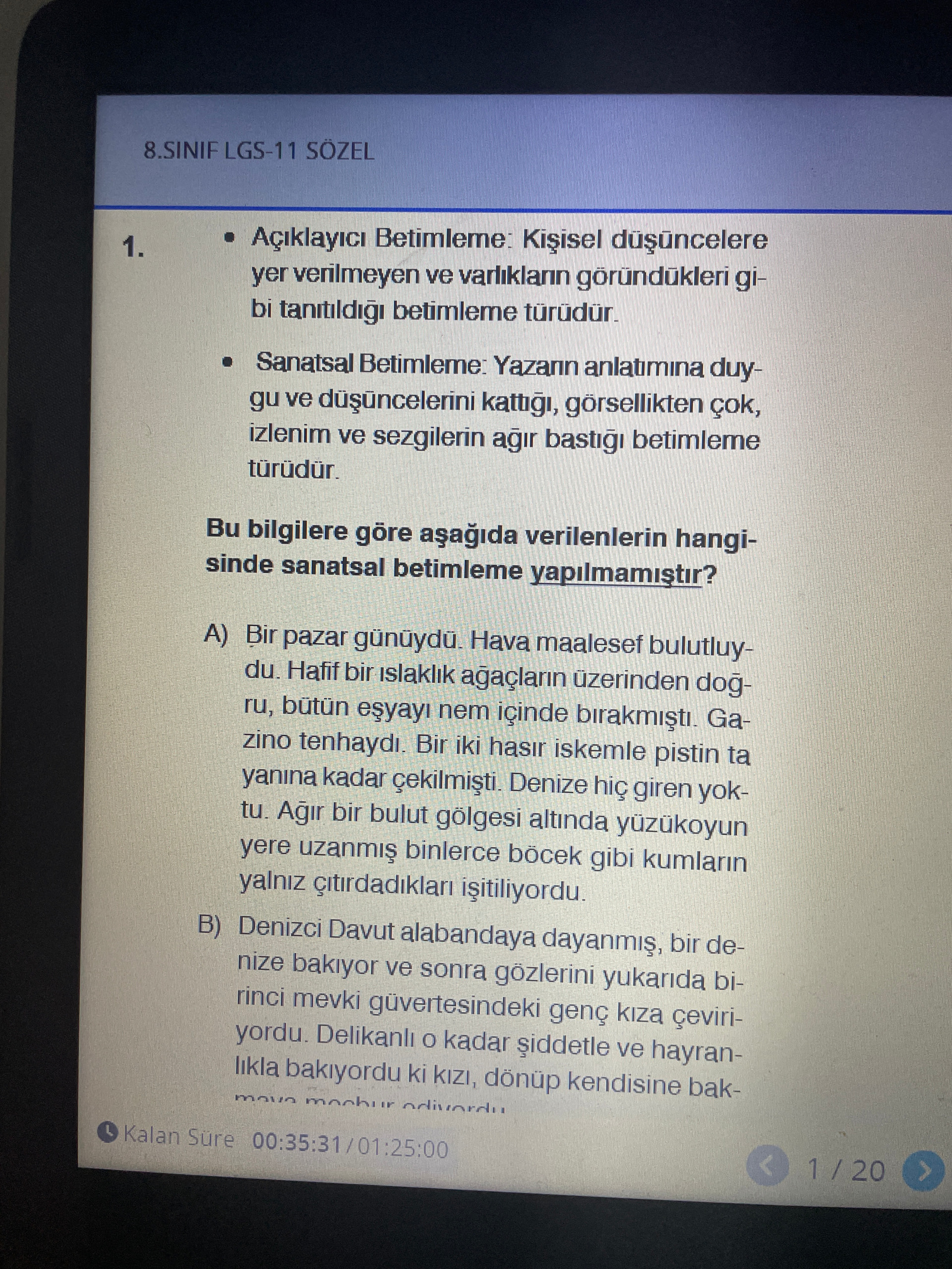 A şıkkı: “Bir pazar günüydü. Hava maalesef bulutluydu. Hafif bir ıslaklık ağaçların üzerinden doğruca, bütün eşyayı nem içinde bırakmıştı. Sapına tenhaydı. Bir iki hasır iskemle pistin ta yanına kadar çekilmişti. Denize hiç girilmemişti ve tahta bir dut ağacı gölgesi altında yaz boyunca binlerce böcek gibi kumların üzerinde daldan sarkıyordu.” A seçeneğinde yazar anlatıma duygularını, gözlemlerini, öznel ifadelerini ve imgeli, sanatsal bir dil katmıştır. Özellikle hava durumu, ortamın nemli olması, iskemlelerin sahildeki görüntüsü gibi ayrıntılar gözlemler aracılığıyla ve kişisel duygularla aktarılmıştır. Yani burada sanatsal betimleme yapılmıştır.