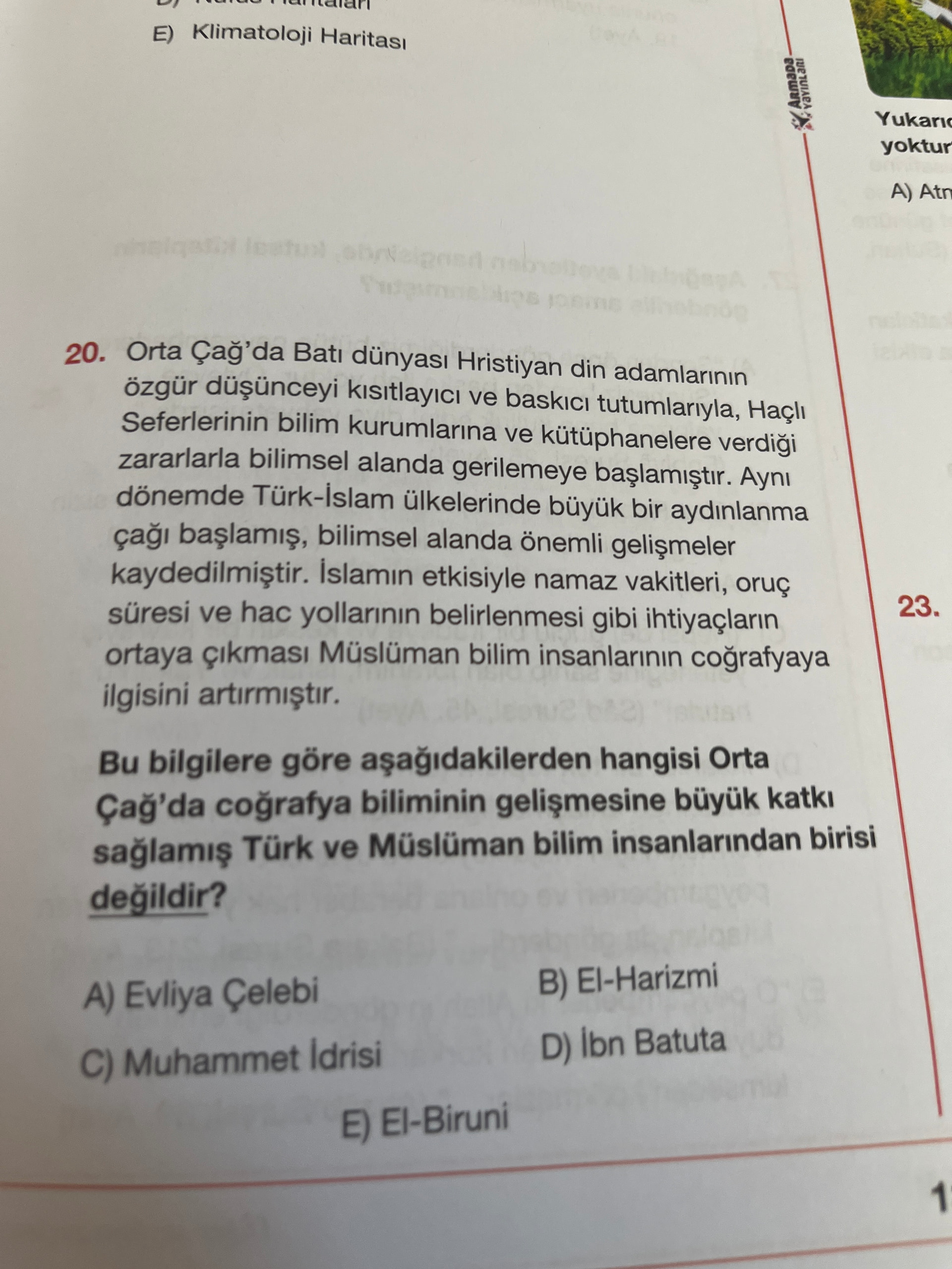 Bu bilgilere göre aşağıdakilerden hangisi Orta Çağ’da coğrafya biliminin gelişmesine büyük katkı sağlamış Türk ve Müslüman bilim insanlarından birisi değildir?