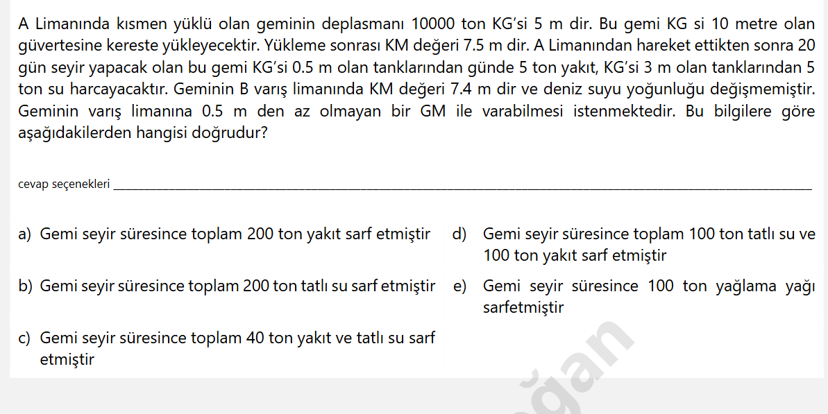 A Limanında kısmen yüklü olan geminin deplasmanı 10000 ton KG’si 5 m dir. Bu gemi KG si 10 metre olan güvertesine kereste yükleyecektir. Yükleme sonrası KM değeri 7.5 m dir. A Limanından hareket ettikten sonra 20 gün seyir yapacak olan bu gemi KG’si 0.5 m olan tanklarından günde 5 ton yakıt, KG’si 3 m olan tanklarından 5 ton su harcayacaktır. Geminin B varış limanında KM değeri 7.4 m dir ve deniz suyu yoğunluğu değişmemiştir. Geminin varış limanına 0.5 m den az olmayan bir GM ile varabilmesi istenmektedir. Bu bilgilere göre aşağıdakilerden hangisi doğrudur?