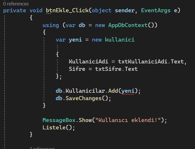 Bu resim, bir C# Windows Forms uygulamasında bir butonun tıklama olayında yeni bir kullanıcıyı veritabanına ekleyen ve ardından kullanıcıya bir mesaj gösteren bir kod bloğunu göstermektedir. Kod, bir AppDbContext nesnesi oluşturarak kullanıcı bilgilerini veritabanına kaydeder.