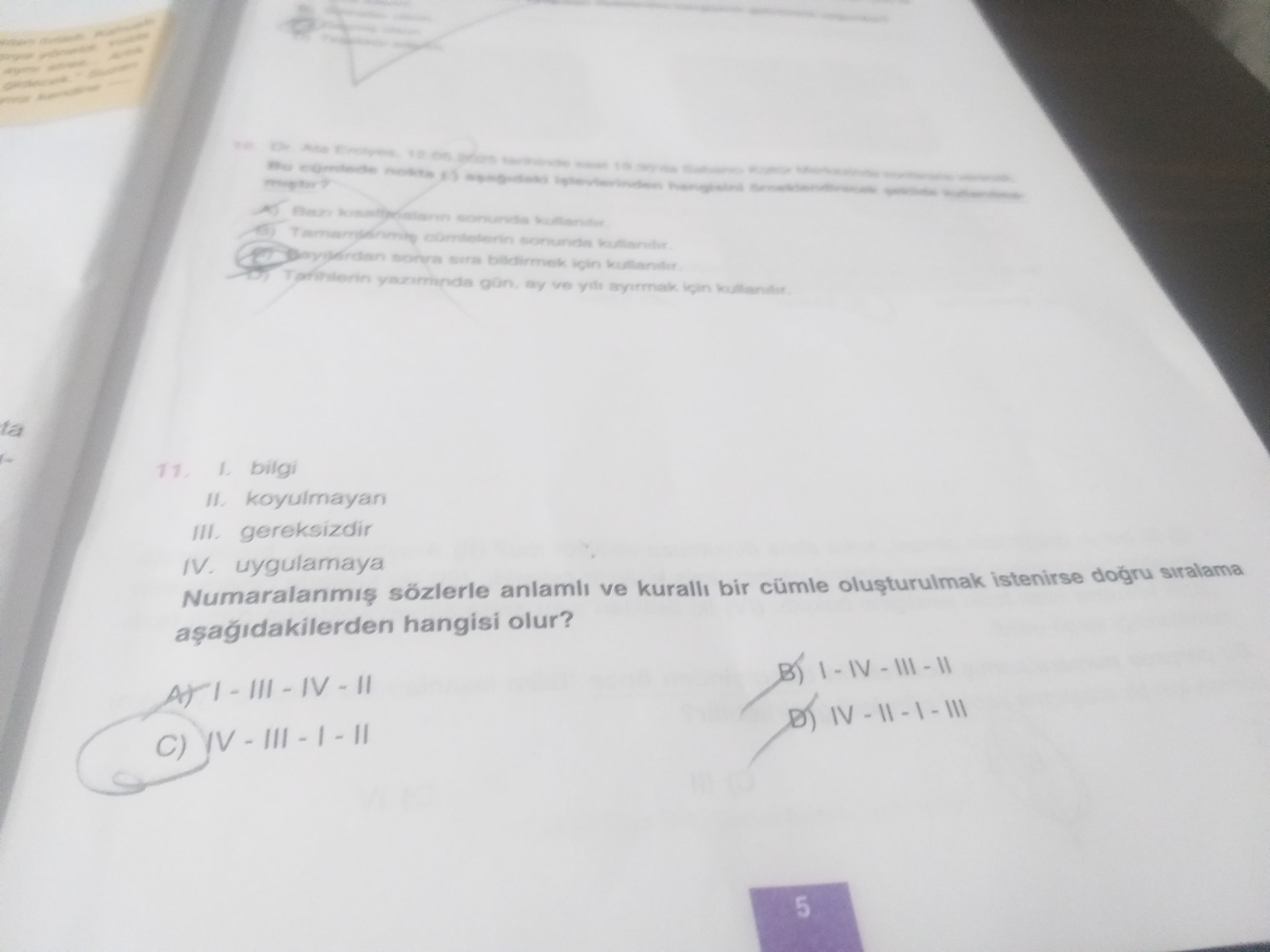 Genel açıklama: Görsel, Türkçe dersi test sayfasından alınmış; nokta işaretinin kullanım yerleri ve sözcükleri doğru sıraya koyarak anlamlı cümle oluşturma becerisini ölçen çoktan seçmeli sorular içeriyor.