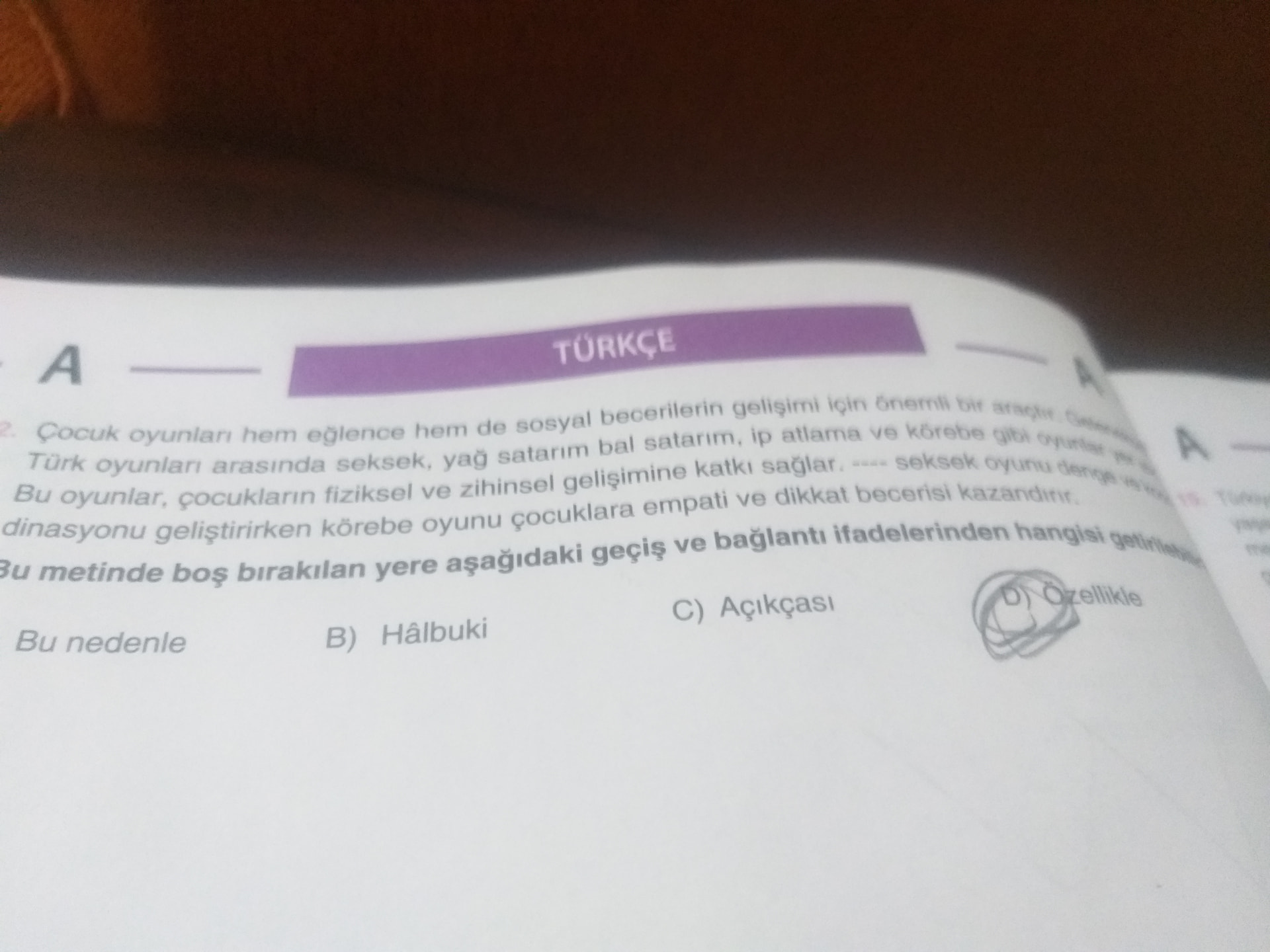 Soruda, boş bırakılan yere uygun geçiş ve bağlantı ifadesi soruluyor. Cümlede örnek olarak “seksek” oyunundan bahsedilmiş, ardından ise “körebe” oyunundan örnek verilerek detaylandırılmış. “Özellikle” kelimesi, genel bir durumdan özel bir duruma geçerken kullanılır. Boşluğa da “özellikle” getirildiğinde anlam bütünlüğü sağlanır:
