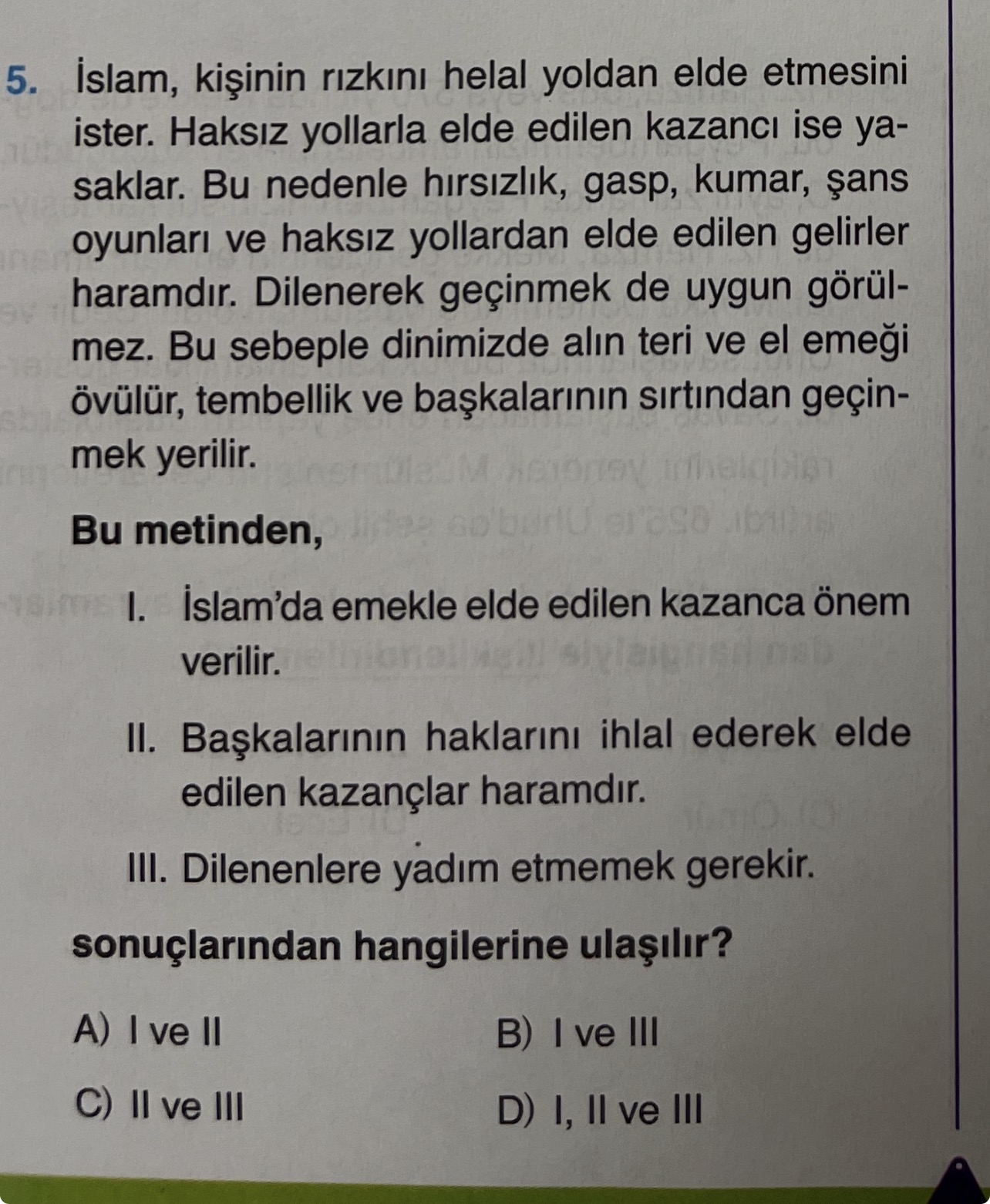 Hırsızlık, gasp, kumar vb. haksız yollarla elde edilen kazançların haram olduğu belirtilmiş. Bu da II. önermeyi doğruluyor.